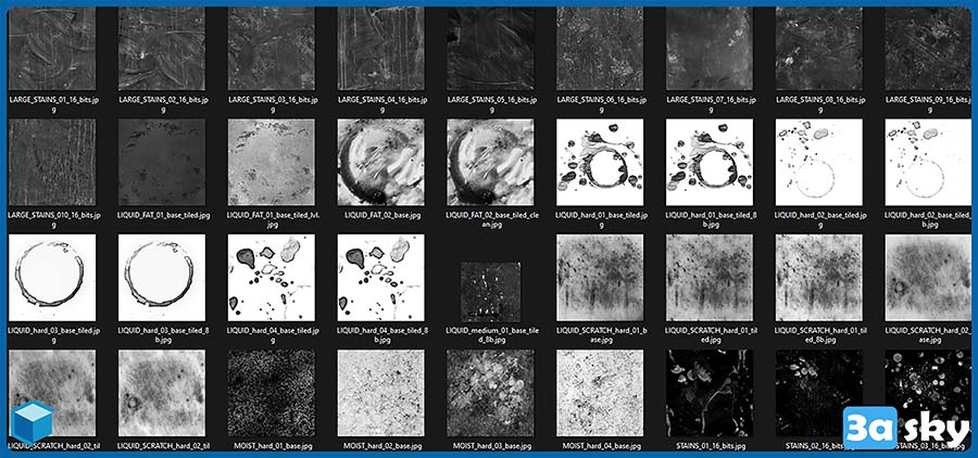 This image showcases a black and white texture with stains and maps preview. It is a versatile texture that can be used in various design projects to create a unique and visually appealing look. The high resolution and quality of this texture make it ideal for enhancing the details and realism of your 3D models. Incorporate this texture into your designs to add depth and interest to your creations.