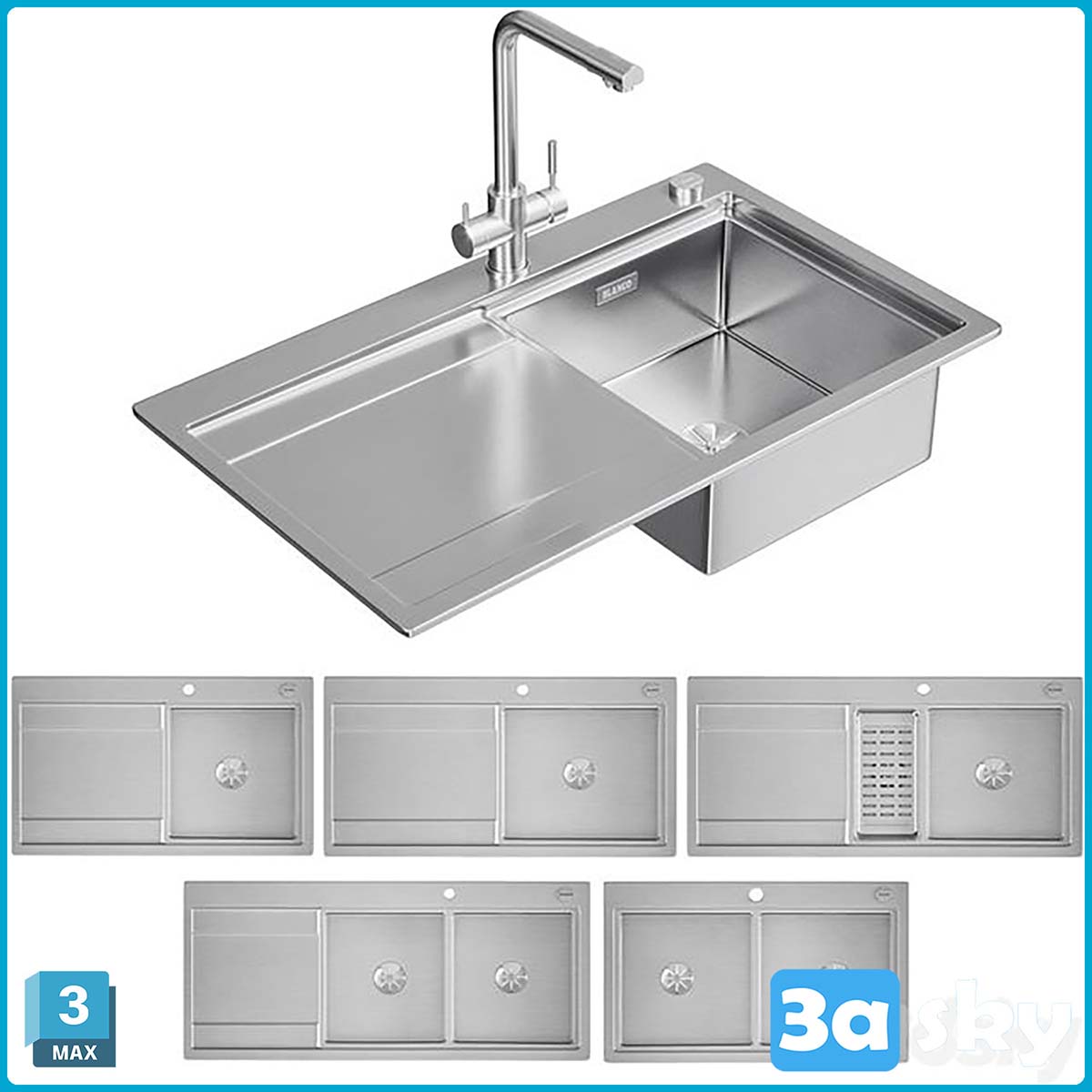 This 3D model features the Blanco Divon II 45 5 6 8s 8 If kitchen design. It includes a sink and various accessories, showcasing a modern and stylish kitchen setup. The model is created in 3DS Max and provides a detailed representation of the Blanco Divon II kitchen configuration.