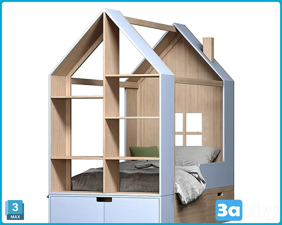 This 3D model features a children's bed designed in the shape of a house, creating a fun and playful element for kids' bedrooms. The design is suitable for children's rooms and adds a whimsical touch to the space. The model is created with attention to detail, making it a great addition to any 3D design project related to kids' furniture or interior design.