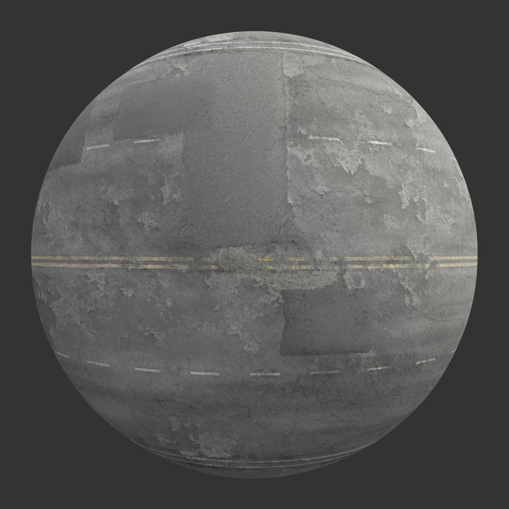 This high-quality 3D texture showcases a city street road with asphalt, designed with four lanes and a damaged surface. The texture is ideal for creating realistic urban environments in 3D modeling projects. The detailed design captures the essence of a worn-out city road, adding authenticity to your digital creations.