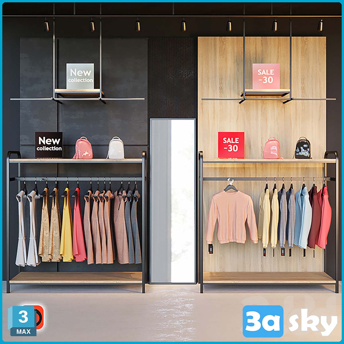 This 3D model showcases a clothing store interior, ideal for architectural visualization and interior design projects. The detailed design includes shelves, racks, and display areas for showcasing fashion items. Perfect for creating realistic retail environments in 3D renderings.