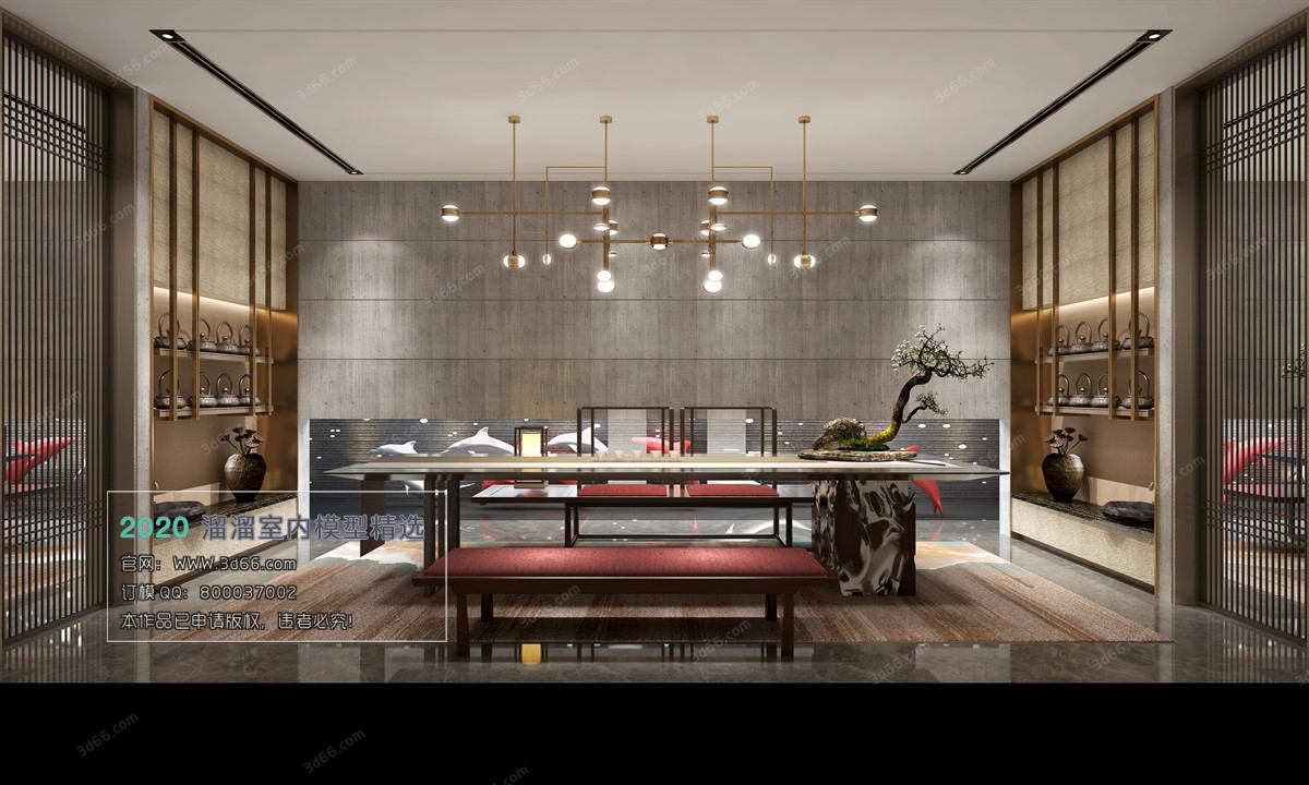 This 3D scene features a ClubHouse designed in Chinese style with intricate details. The Corona model showcases a blend of traditional and modern architectural elements, creating a visually stunning representation. Perfect for architectural visualization projects and interior design inspiration.