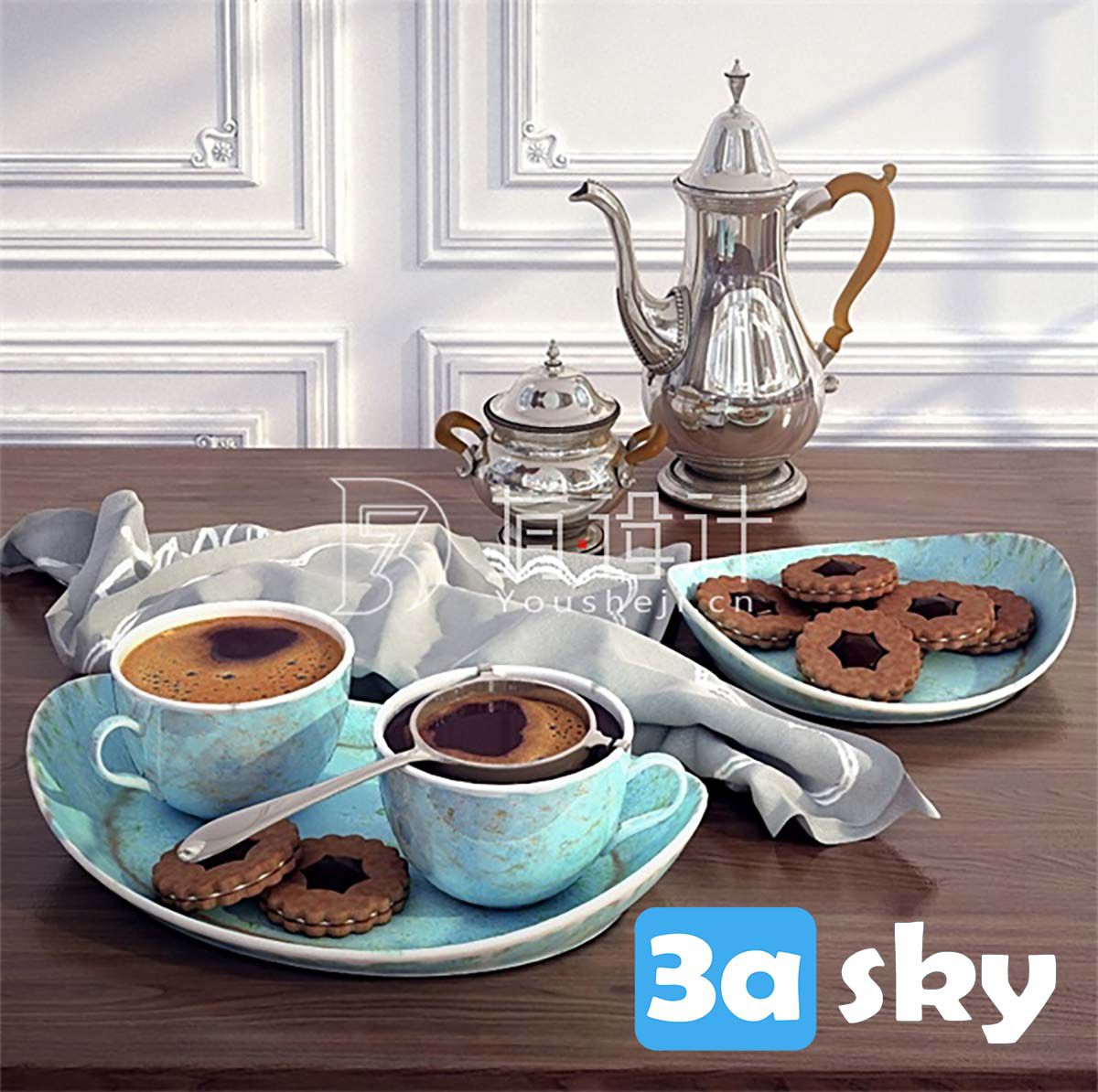 This 3D model showcases a kitchen scene with a focus on coffee and biscuit elements. It is a detailed representation suitable for interior design projects. The scene includes realistic textures and lighting, making it a valuable asset for designers and architects.