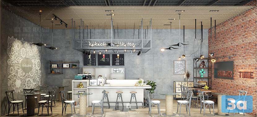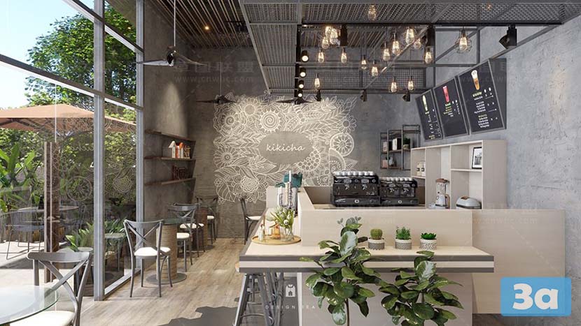 This 3D scene showcases a coffee shop interior design created in Sketchup and rendered with Vray. The space exudes a cozy ambiance with modern decor elements. Perfect for those looking for inspiration in designing their own coffee shop or cafe interior.