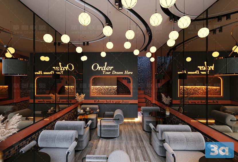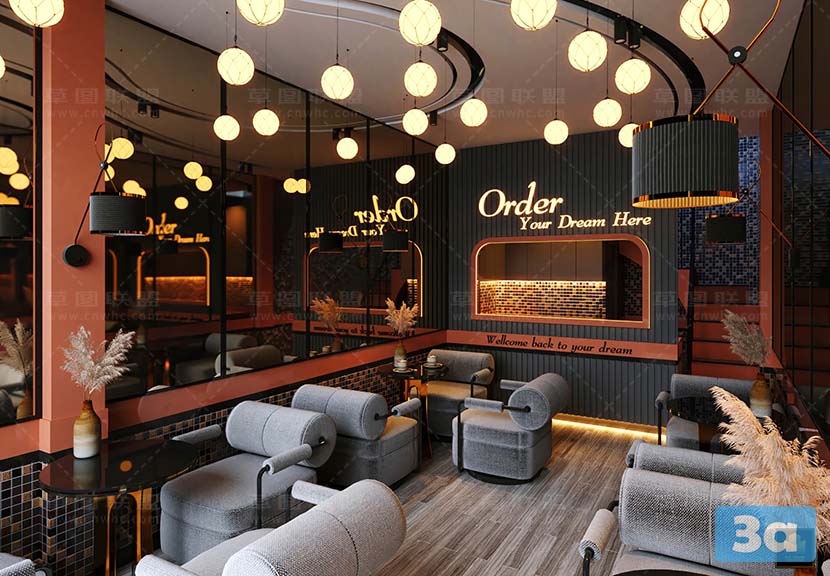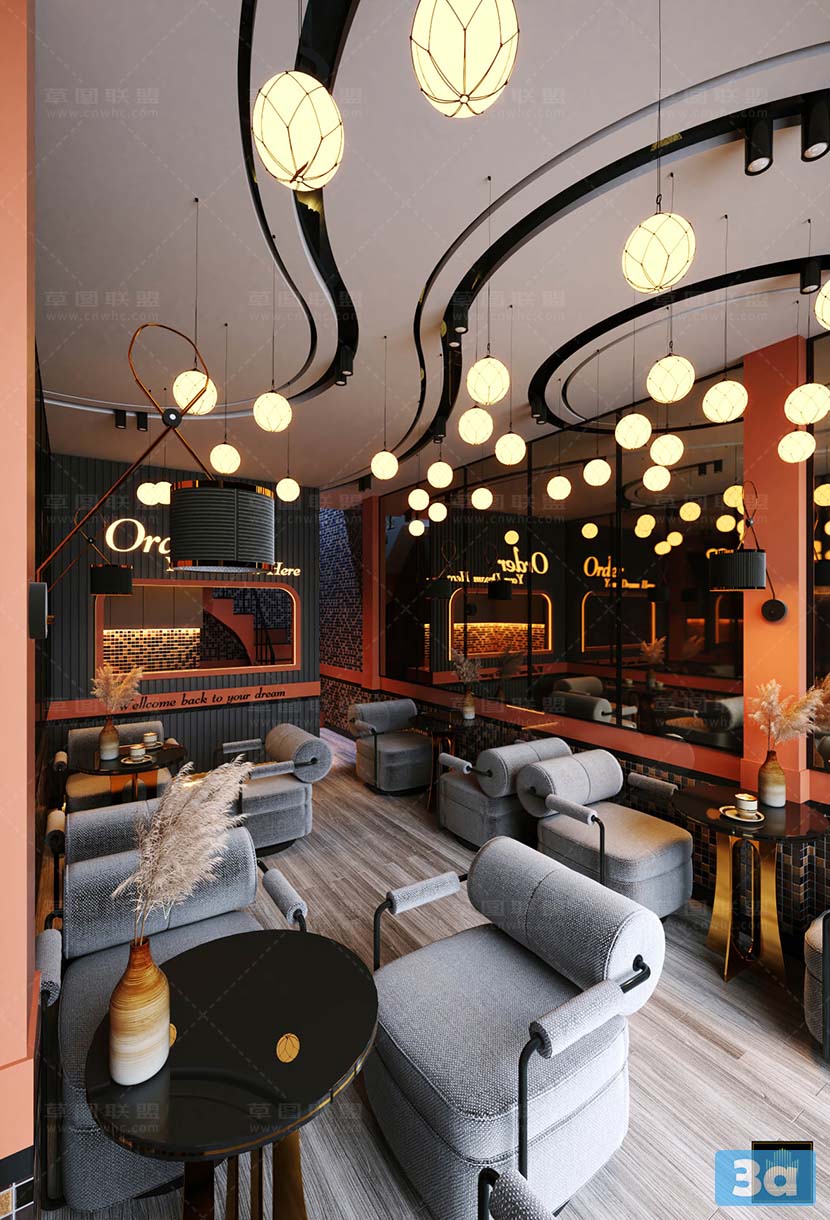 This 3D scene showcases a coffee shop interior design rendered in Sketchup with Vray. The space exudes a cozy ambiance with modern decor elements. Perfect for those looking for inspiration in coffee shop interior design.