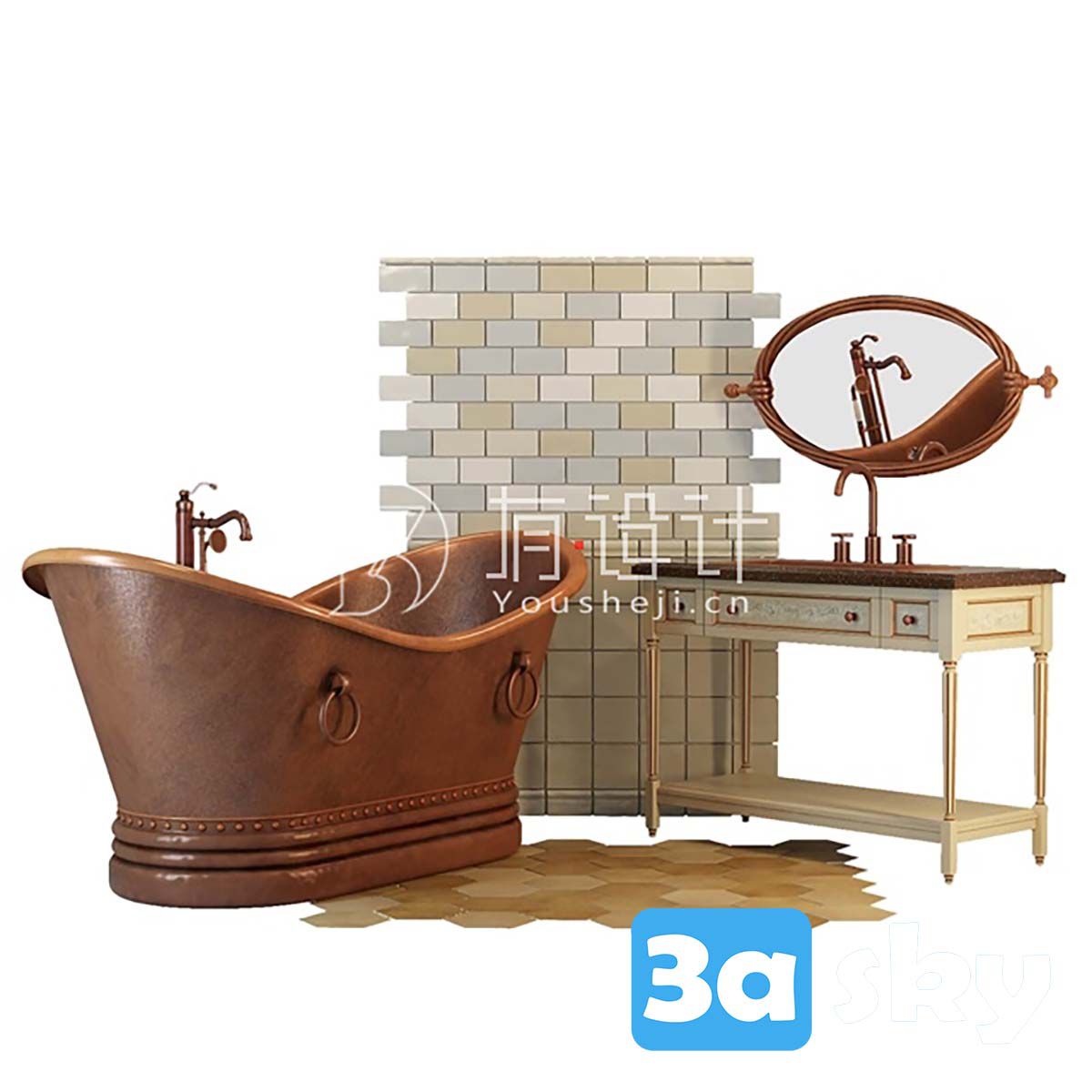 This 3D model showcases a luxurious copper bath suitable for bathroom and WC settings. The intricate design and realistic textures make it a perfect addition to interior design projects. The model is created with attention to detail, providing a high-quality visual representation of a stylish and elegant copper bath.