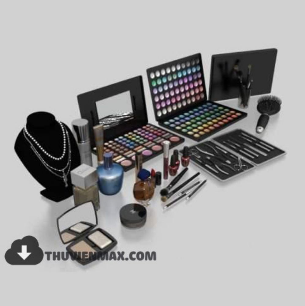 This 3D model preview showcases a cosmetics set with intricate details and textures. Explore the beauty products, makeup items, and skincare essentials in this visually appealing presentation. Get a closer look at the design elements and quality of the model for your creative projects.