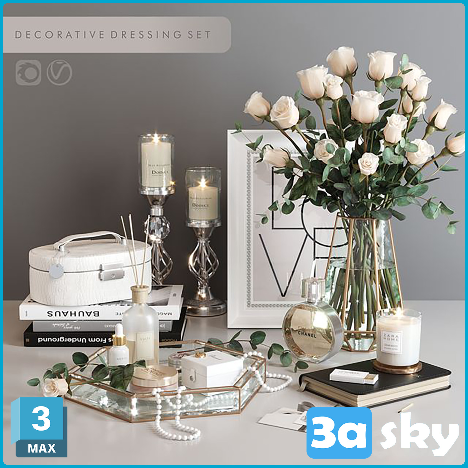 This 3D model features a decorative dressing set, ideal for adding a touch of elegance to interior design projects. The set includes various decorative elements that can enhance the overall aesthetic of any space. Download this high-quality 3D model now and elevate your design projects.