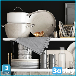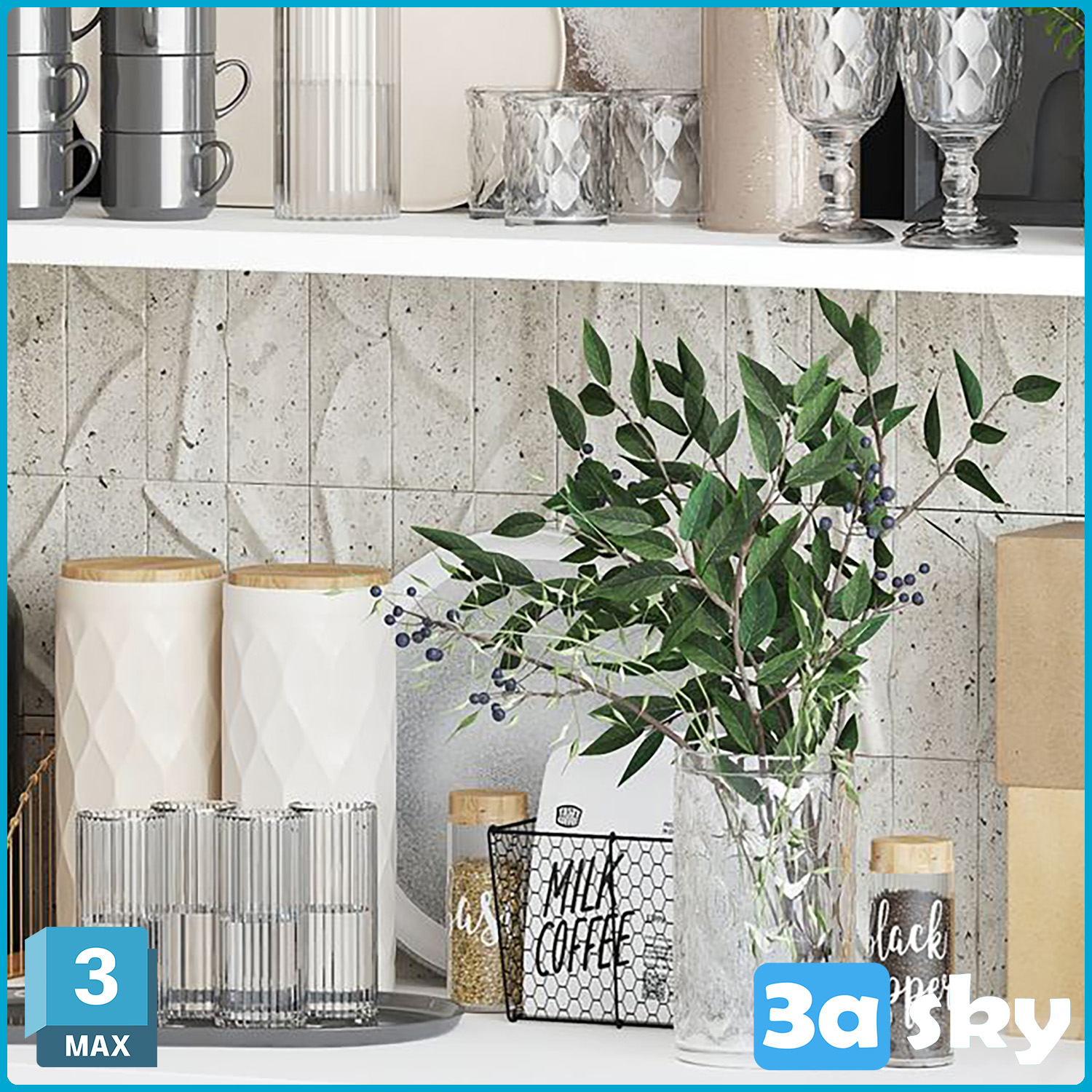 This 3D model showcases a decorative set designed for the kitchen environment. It includes various elements that can enhance the visual appeal of a kitchen space. The model is created using 3DS MAX software, ensuring high-quality and detailed rendering. Ideal for interior designers and architects looking to incorporate stylish and functional elements into their kitchen designs.