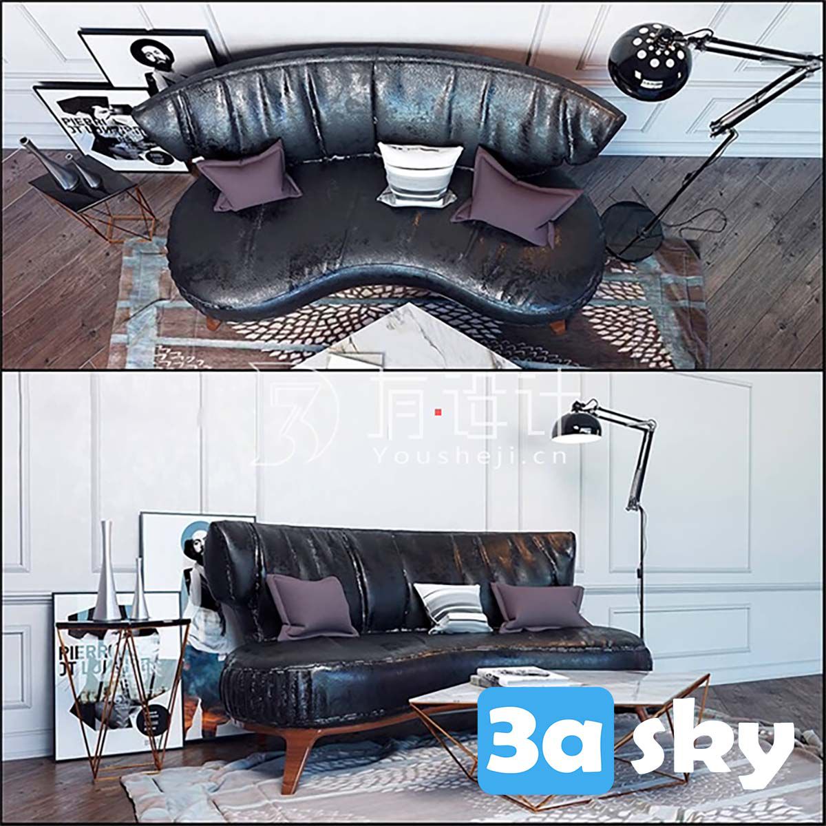 This 3D model showcases a decorative set in a loft environment featuring a stylish sofa from Flexform. Ideal for interior designers and architects looking for high-quality furniture models for their projects.