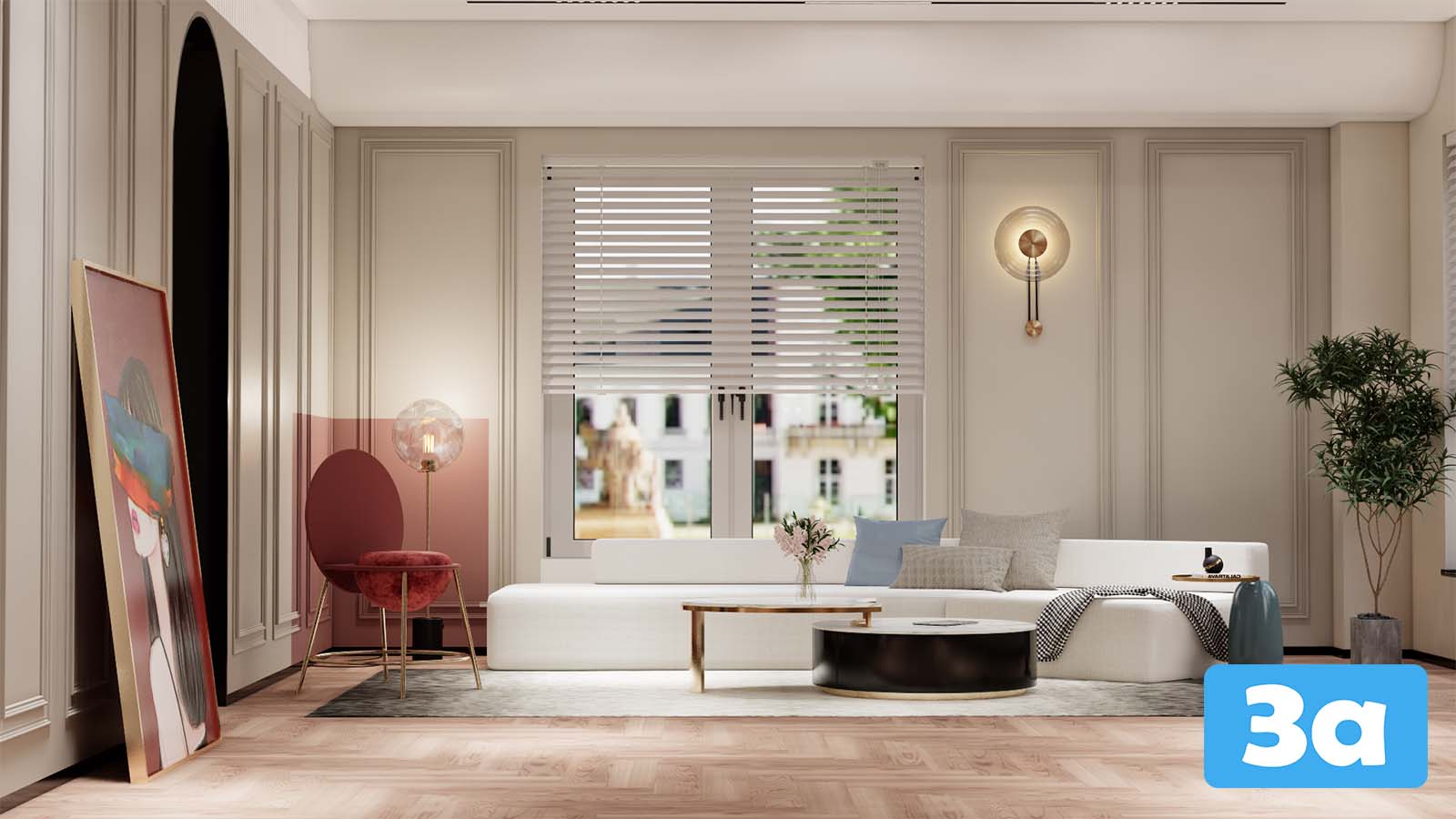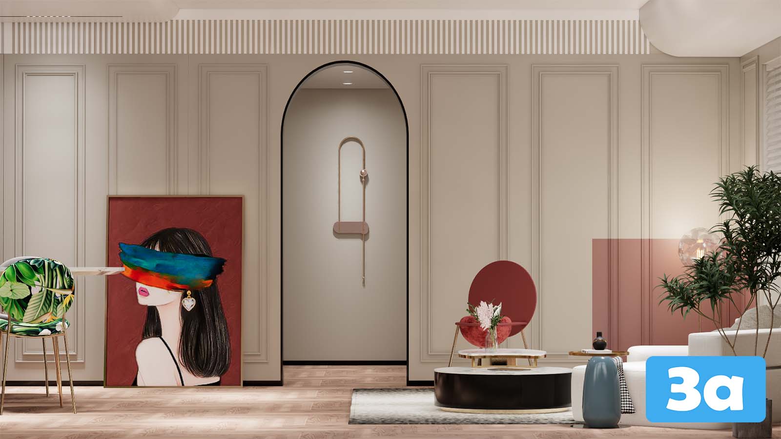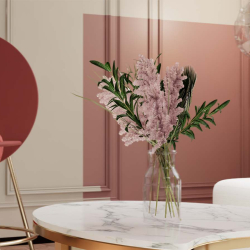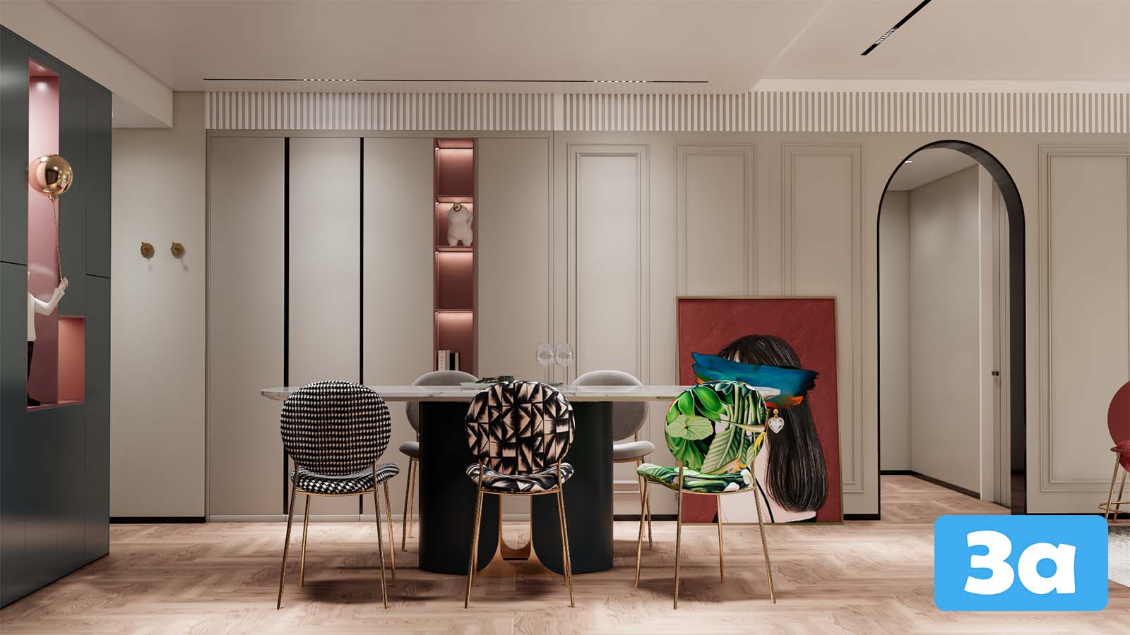 This 3D scene showcases a beautifully designed dining room, featuring elegant furniture and decor. The interior design is created using SketchUp, providing a realistic visualization of a modern dining space.