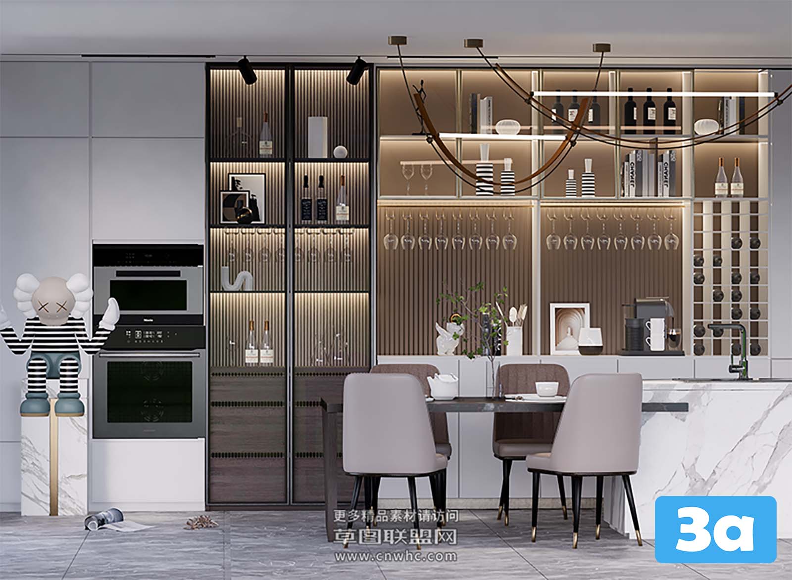 This 3D scene showcases a modern and elegant dining room interior design. The room features stylish furniture and a well-thought-out layout. Perfect for those seeking inspiration for their own dining room design projects.