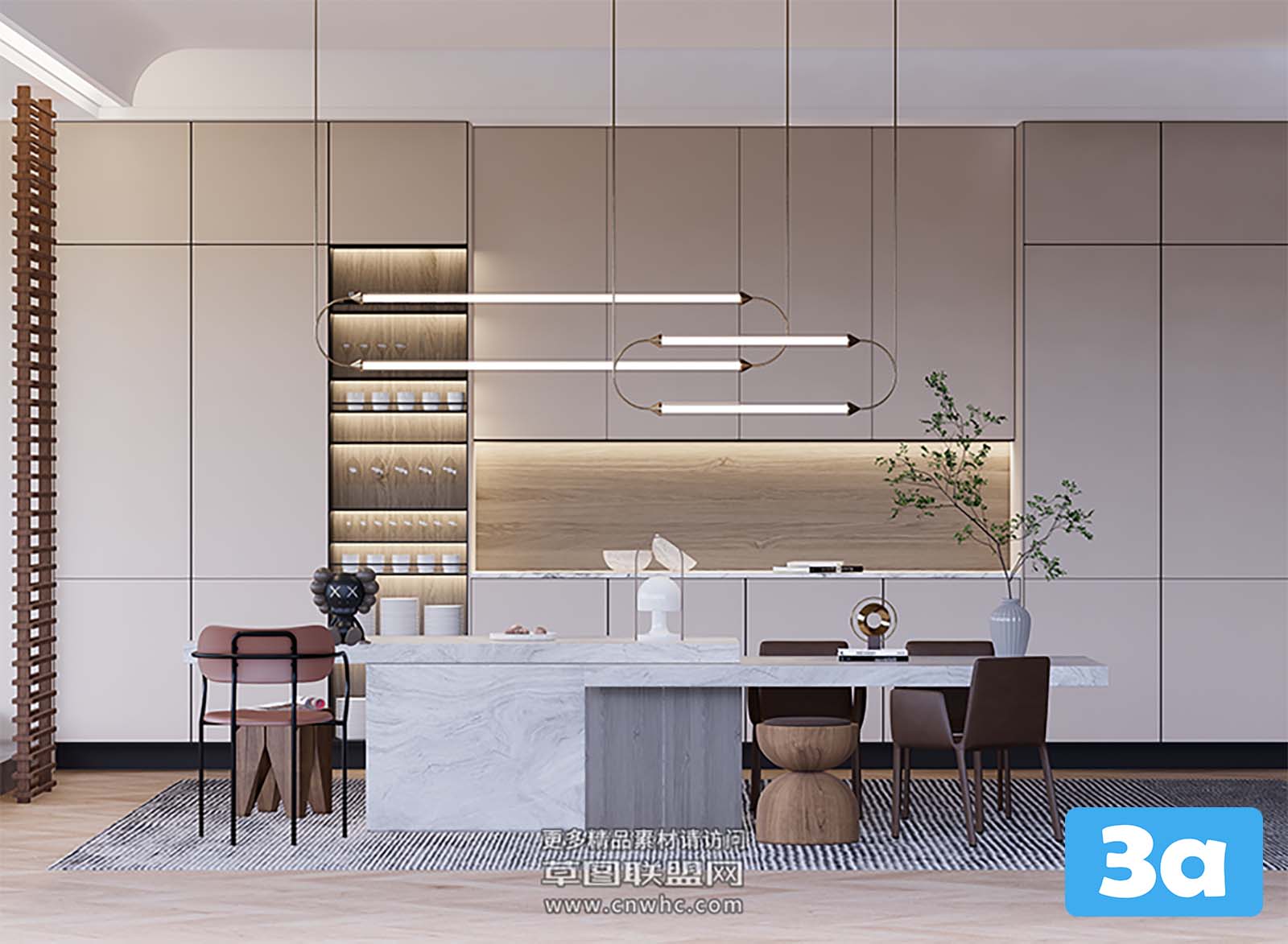 This 3D scene showcases a modern and elegant dining room interior design. The room features stylish furniture and a well-thought-out layout. Explore the details and get inspired for your own interior design projects.