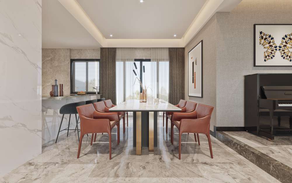 This 3D scene showcases a modern and stylish dining room and kitchen layout. The design features contemporary furniture and decor, creating a welcoming and functional space. Ideal for interior design enthusiasts looking for inspiration and ideas for their own home decor projects.