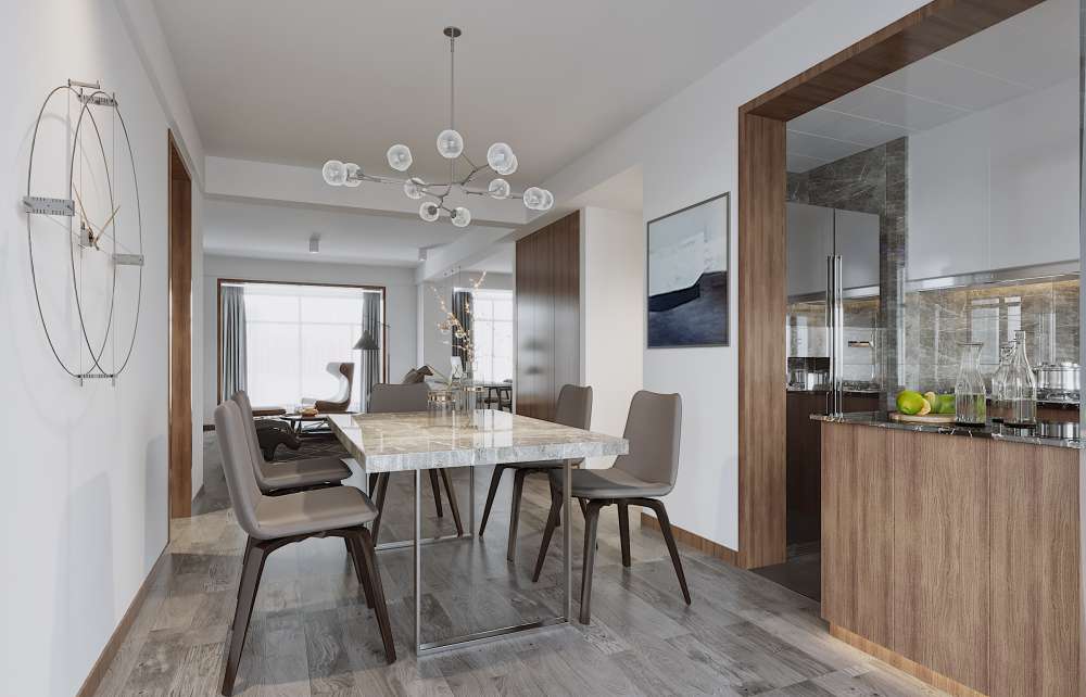 This 3D scene showcases a modern dining room kitchen design, created using 3DS MAX software. The scene features elegant furniture, lighting, and decor elements, providing inspiration for interior design projects and 3D modeling enthusiasts.