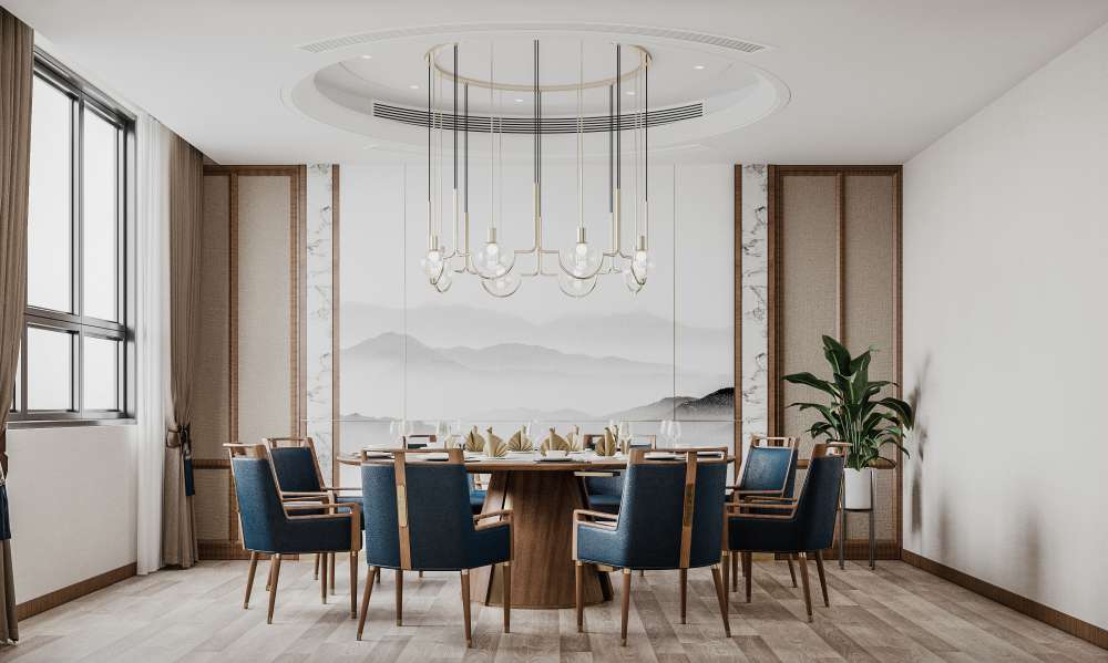 This 3D scene showcases a modern and stylish dining room and kitchen layout. The design features contemporary furniture, elegant decor, and a harmonious color scheme. Ideal for interior designers, architects, and home decor enthusiasts looking for inspiration and visualization of their projects.