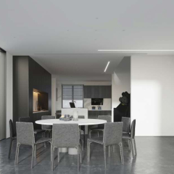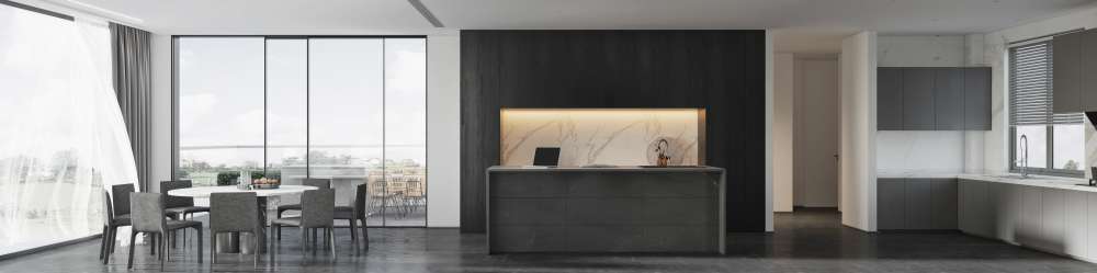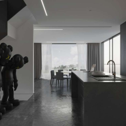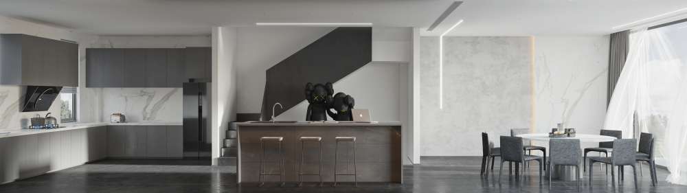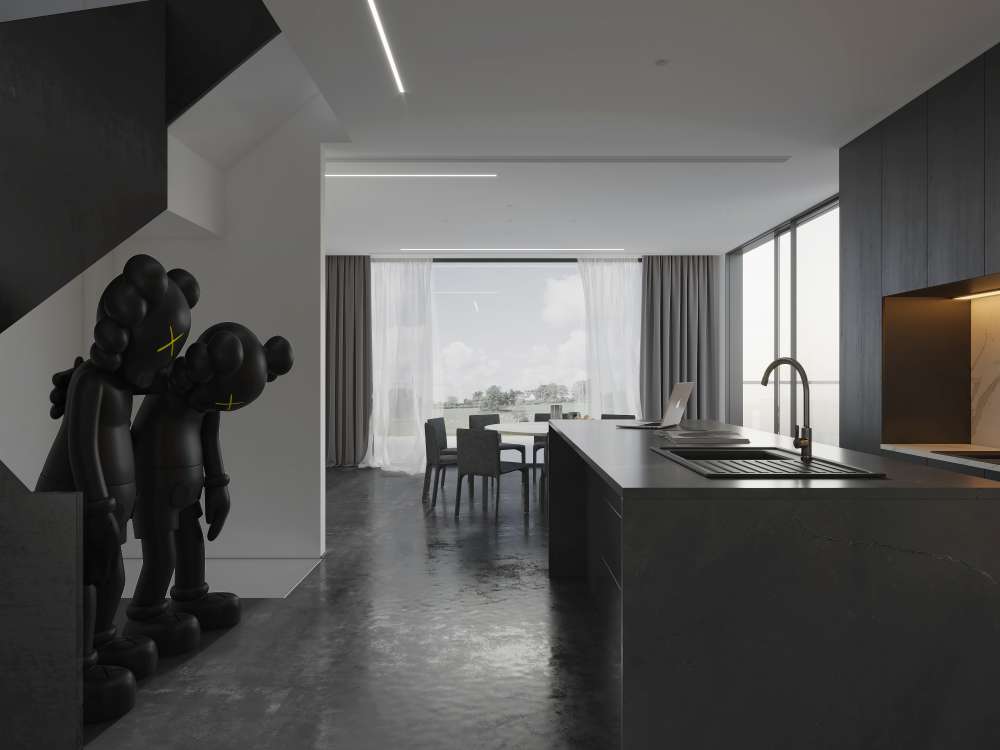 This 3D scene showcases a beautifully designed dining room and kitchen, featuring modern furniture and stylish decor. Ideal for interior design enthusiasts and professionals looking for inspiration and visualization of contemporary living spaces.