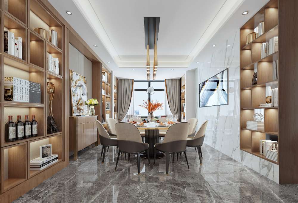 This 3D scene showcases a modern dining room and kitchen design. The interior features contemporary furniture and decor, creating a stylish and inviting space. Explore the details of this 3D model to gather inspiration for your own interior design projects.