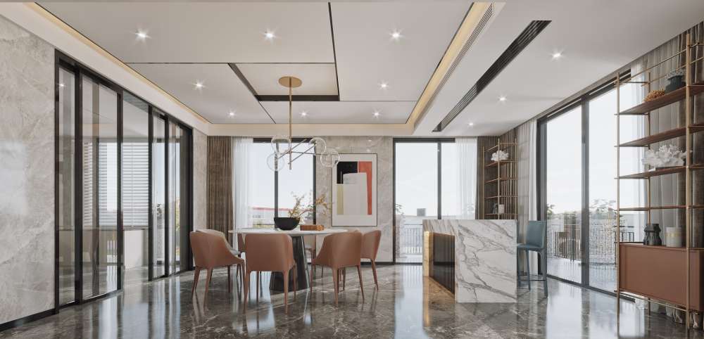 This 3D scene showcases a modern and stylish dining room and kitchen. The design features contemporary furniture and decor, creating a welcoming and elegant space. Perfect for interior designers, architects, and home decor enthusiasts looking for inspiration.