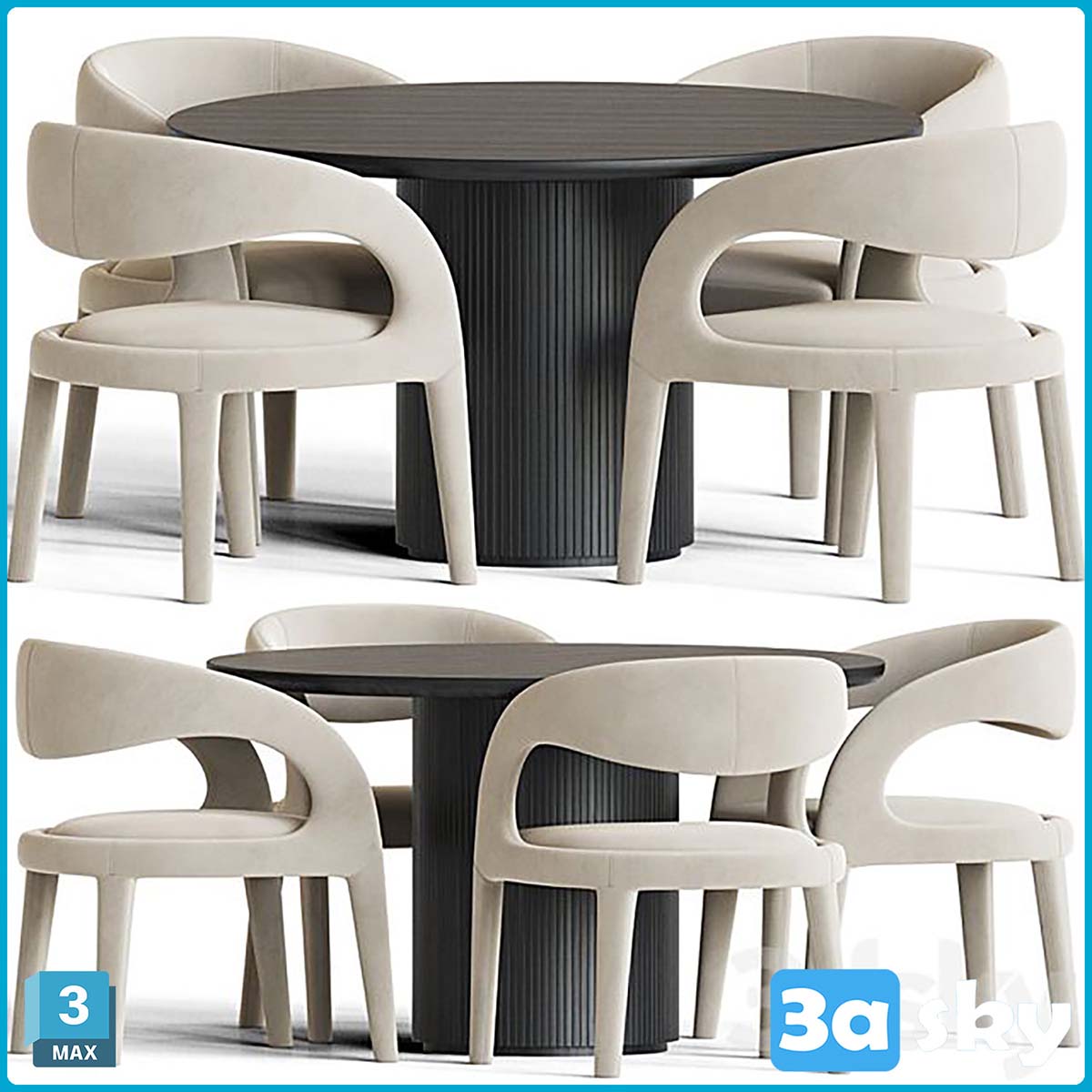 This 3D model showcases a dining set featuring a table with chairs. It is a high-quality furniture model suitable for interior design projects. The set includes detailed textures and realistic rendering, making it a great addition to your 3D assets collection.