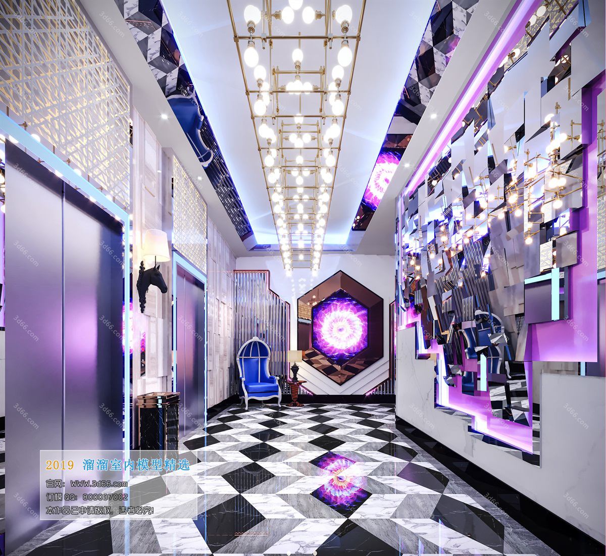 This 3D scene showcases an elevator lobby with a mix of modern styles. The design features a sleek and contemporary look, perfect for a sophisticated environment. The image highlights the attention to detail in the interior design, creating a welcoming and stylish space.