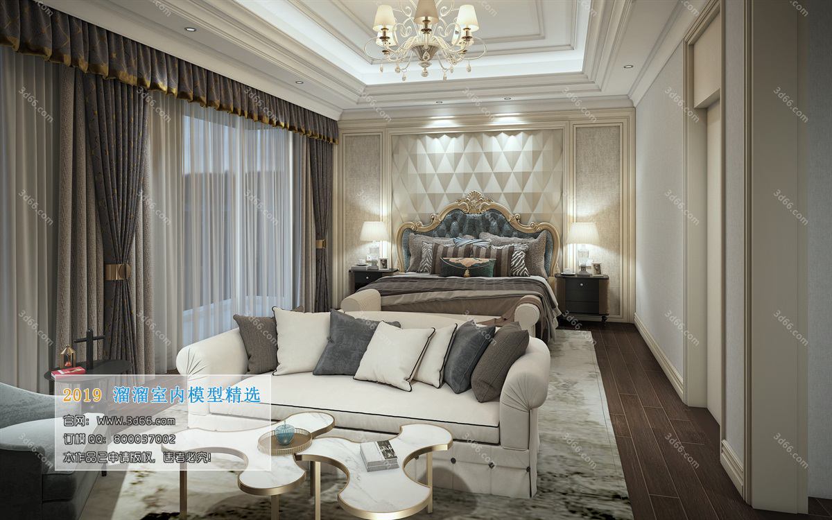 This 3D scene showcases a bedroom space designed in European style. The room features elegant furniture and a sophisticated layout. Explore the intricate details and design elements in this preview image.