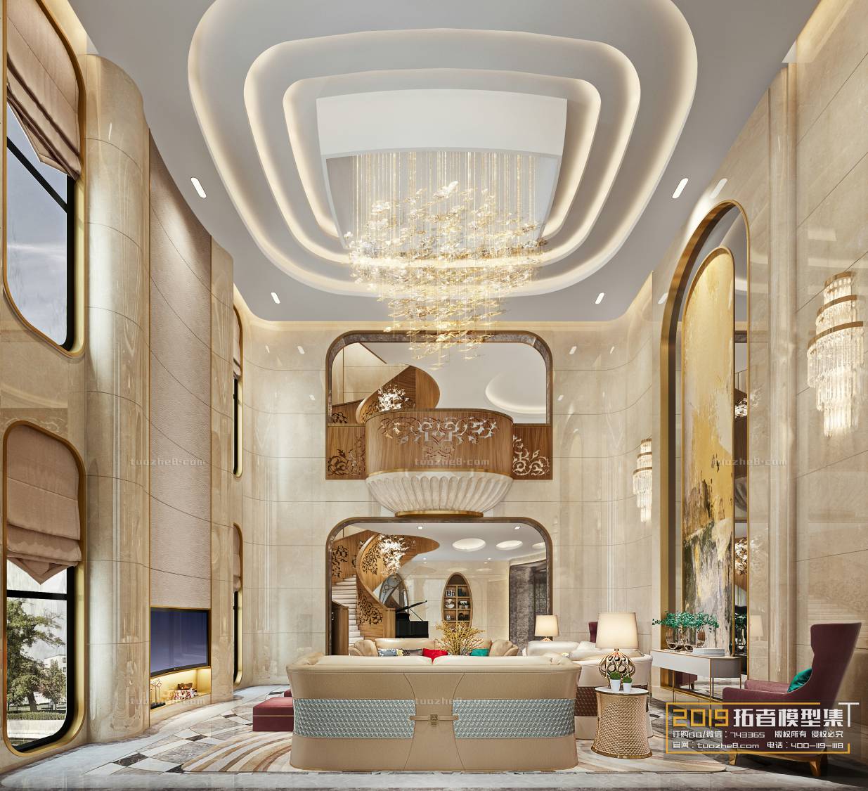 This 3D scene showcases a luxurious living room designed in European style. The interior features elegant furniture, intricate decor, and a sophisticated color palette. Explore the beauty and craftsmanship of this virtual living space.