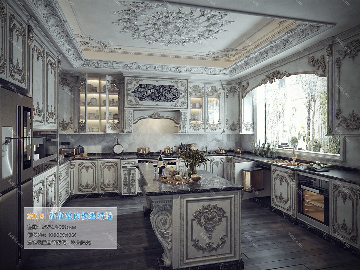 This 3D scene showcases a restaurant kitchen designed in European style. The intricate details and layout of the kitchen provide a realistic view of a modern and stylish restaurant kitchen. Explore the design elements and architecture of this beautifully crafted 3D scene.