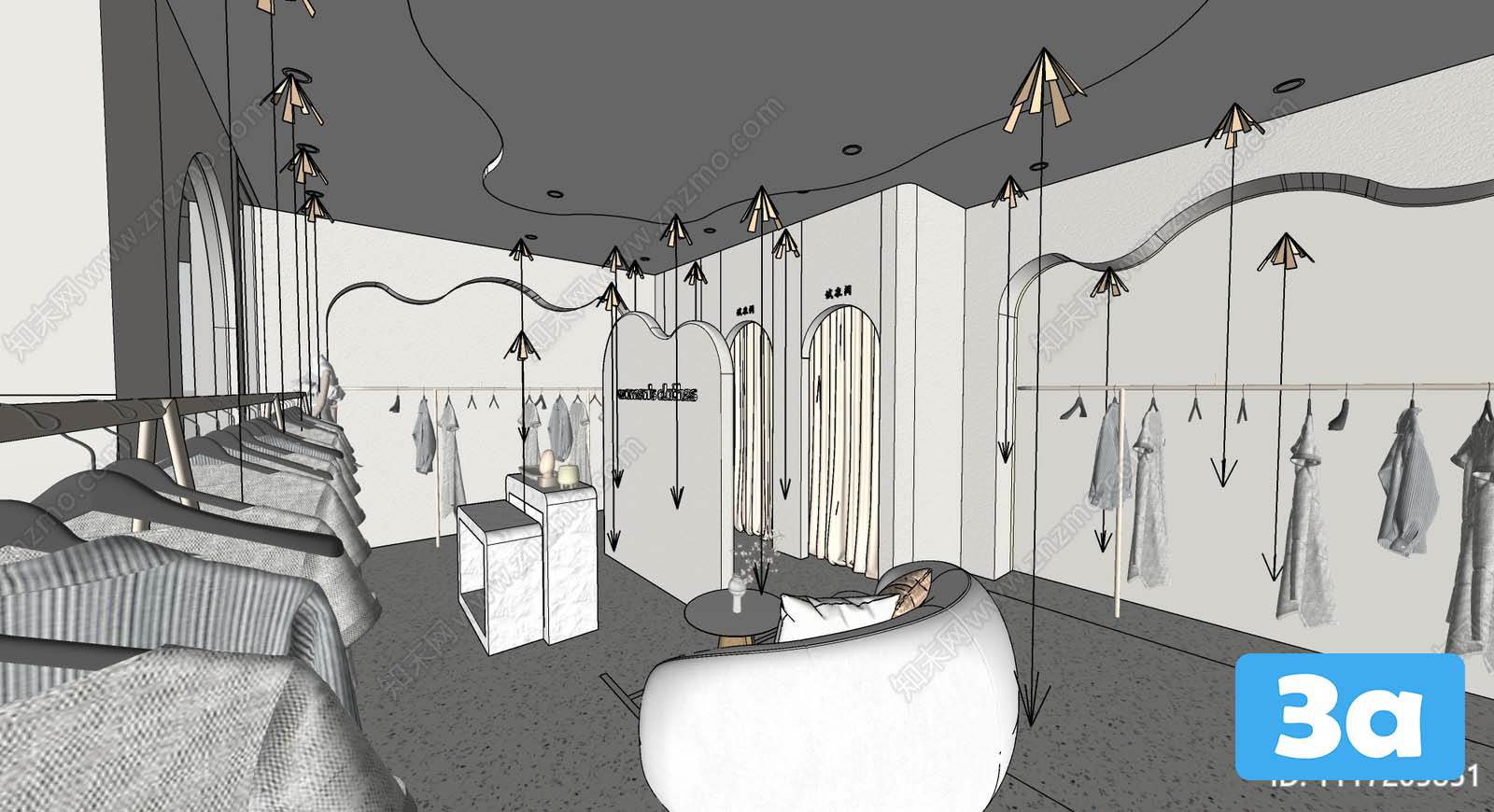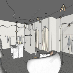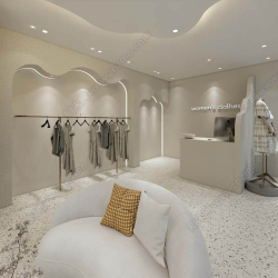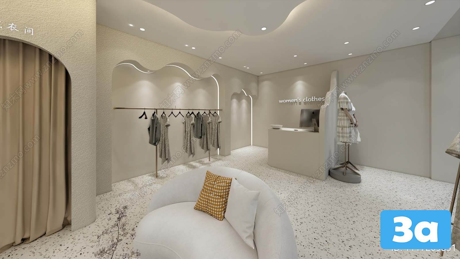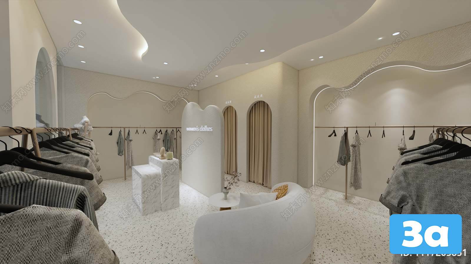 This 3D scene showcases the interior design of a fashion shop, featuring a modern and stylish layout. The design includes various elements such as clothing racks, mannequins, and display shelves. Explore this visually appealing scene for inspiration in fashion retail design.