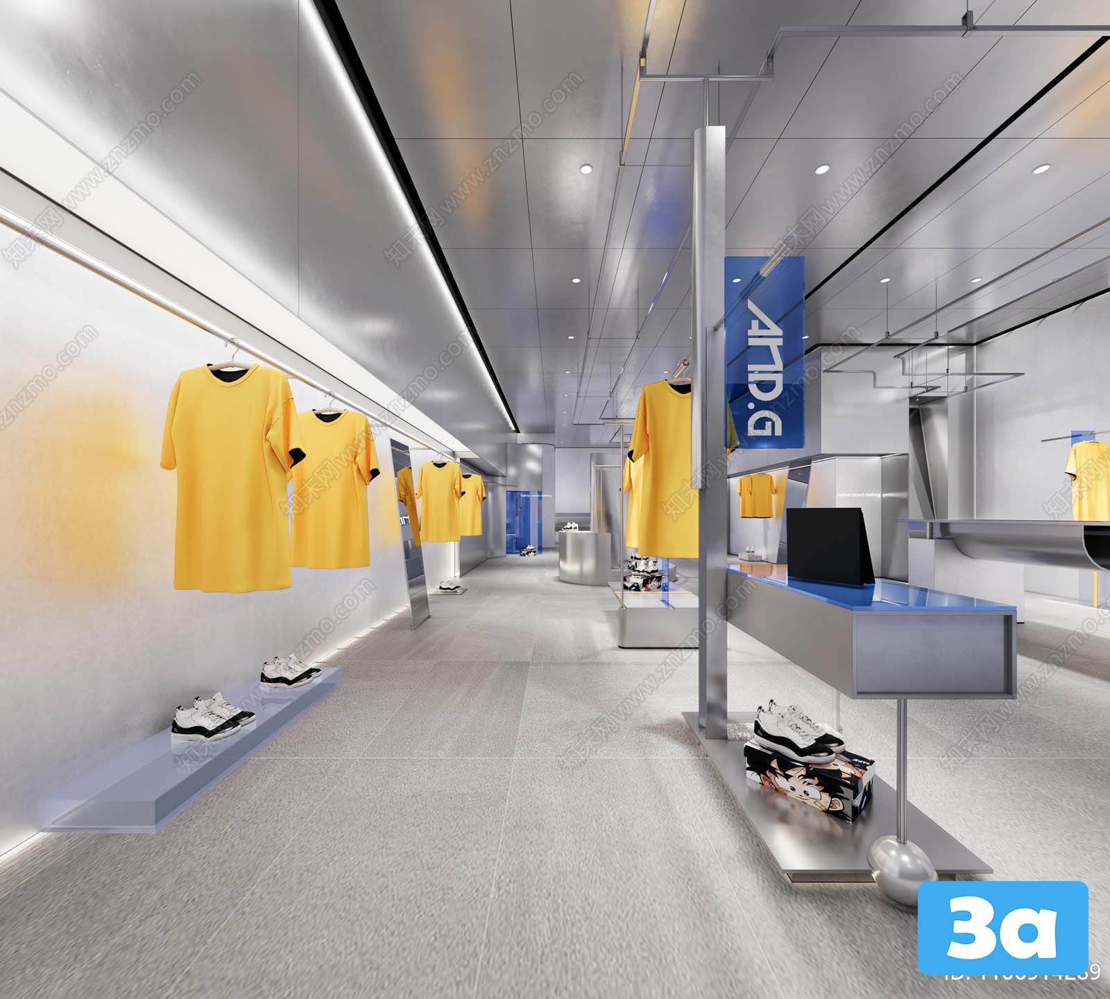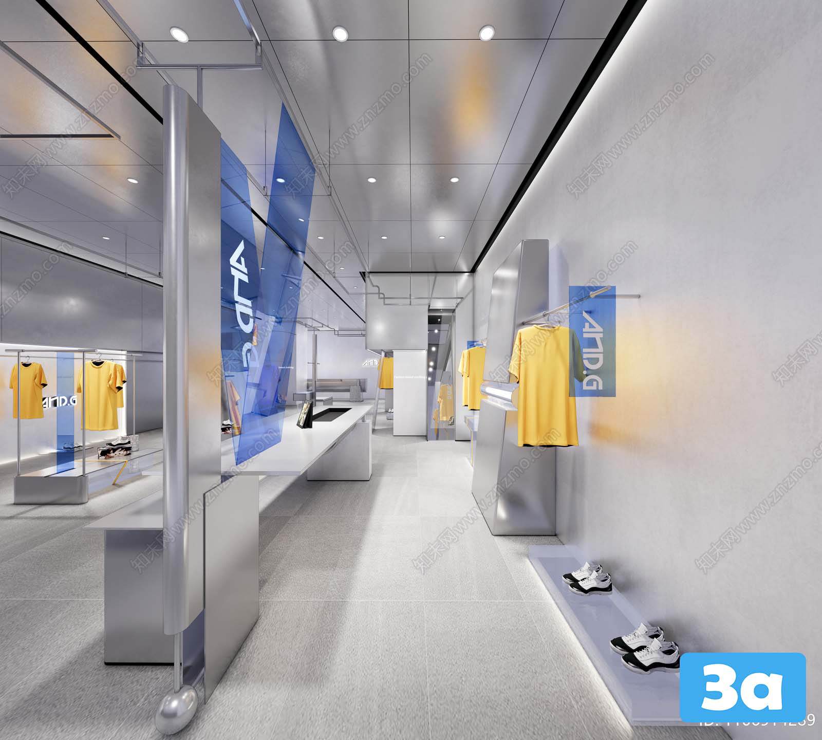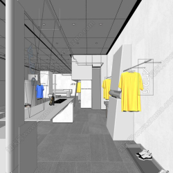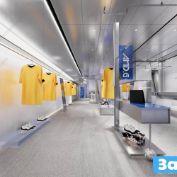 This 3D scene features a fashion shop interior design with a modern and elegant aesthetic. The space is designed to blend style with functionality, creating a visually appealing and practical environment. Explore the details of this scene to get inspiration for your own interior design projects.