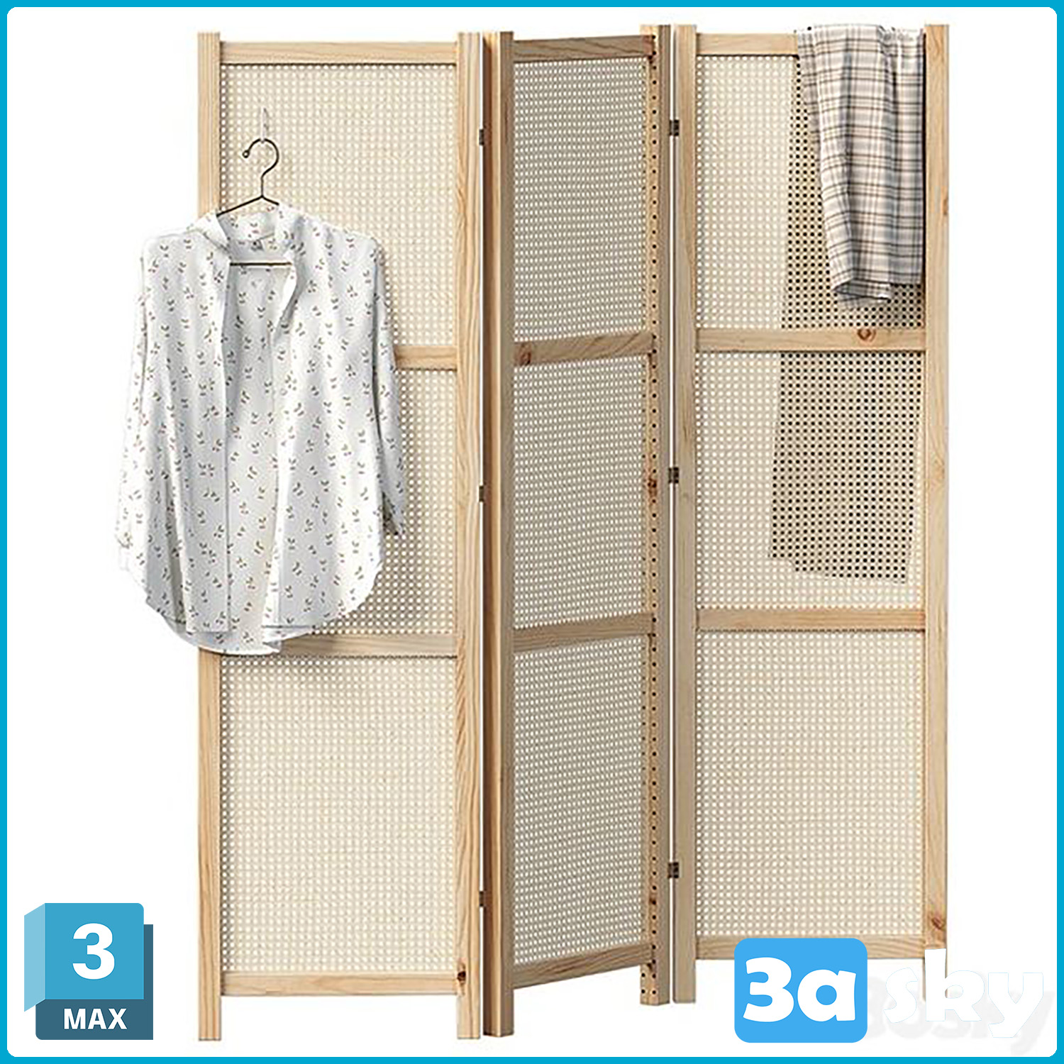 This 3D model features a folding screen with intricate rattan decoration, suitable for adding a touch of elegance to interior design projects. The design showcases a blend of traditional and modern elements, making it a versatile piece for various settings.