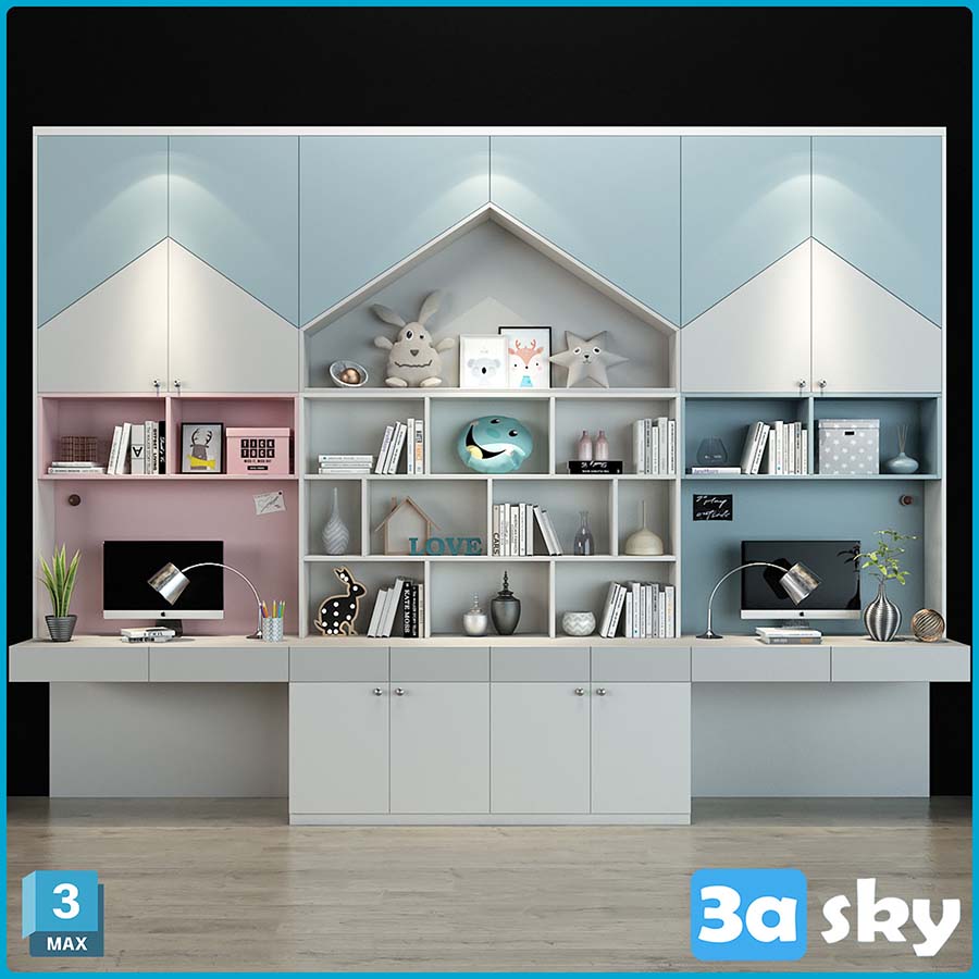 This 3D model features a collection of furniture specifically designed for children's rooms. It includes items such as desks, chairs, beds, and toy storage units, all tailored to create a playful and functional space for kids. The design is colorful and engaging, perfect for a vibrant and imaginative playroom setting.