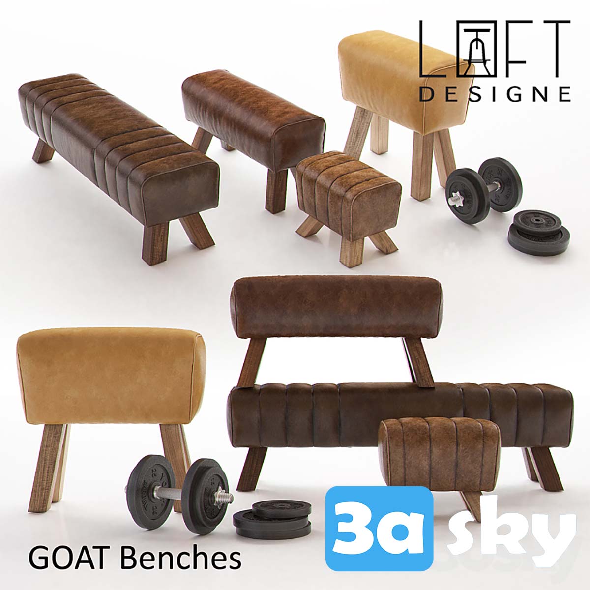 This 3D furniture model features GOAT Benches in a stylish LOFT DESIGNE setting. Ideal for interior design enthusiasts looking to enhance their projects with modern furniture pieces.