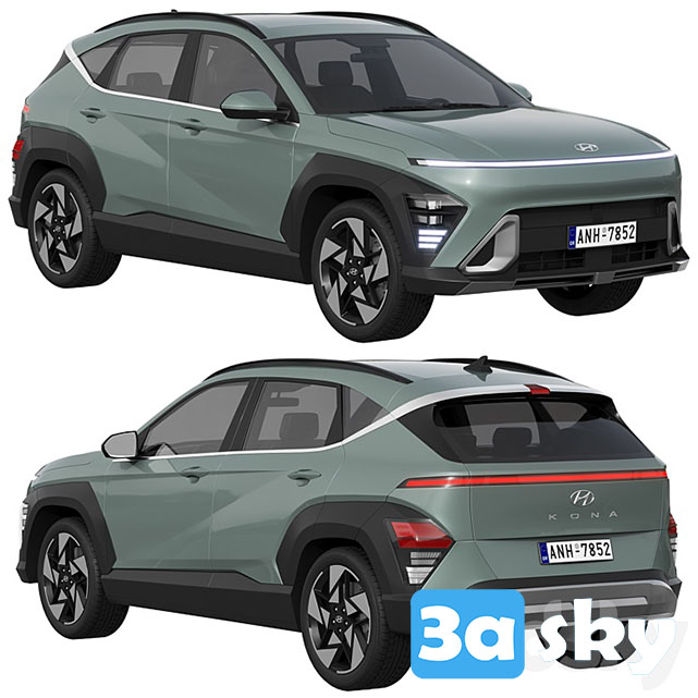This 3D model showcases the preview of the Hyundai Kona 2024, highlighting its design and features. Explore the intricate details of this stylish and innovative vehicle in a decorative setting.