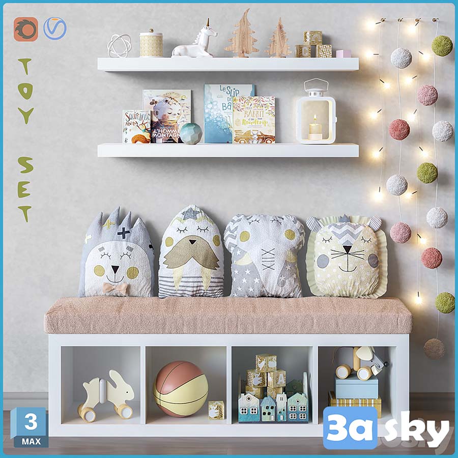 This 3D model showcases a collection of kids toys and furniture set, ideal for interior design and architectural visualization projects. The file is created in 3DS MAX and offers a detailed representation of various items suitable for children's rooms and play areas.