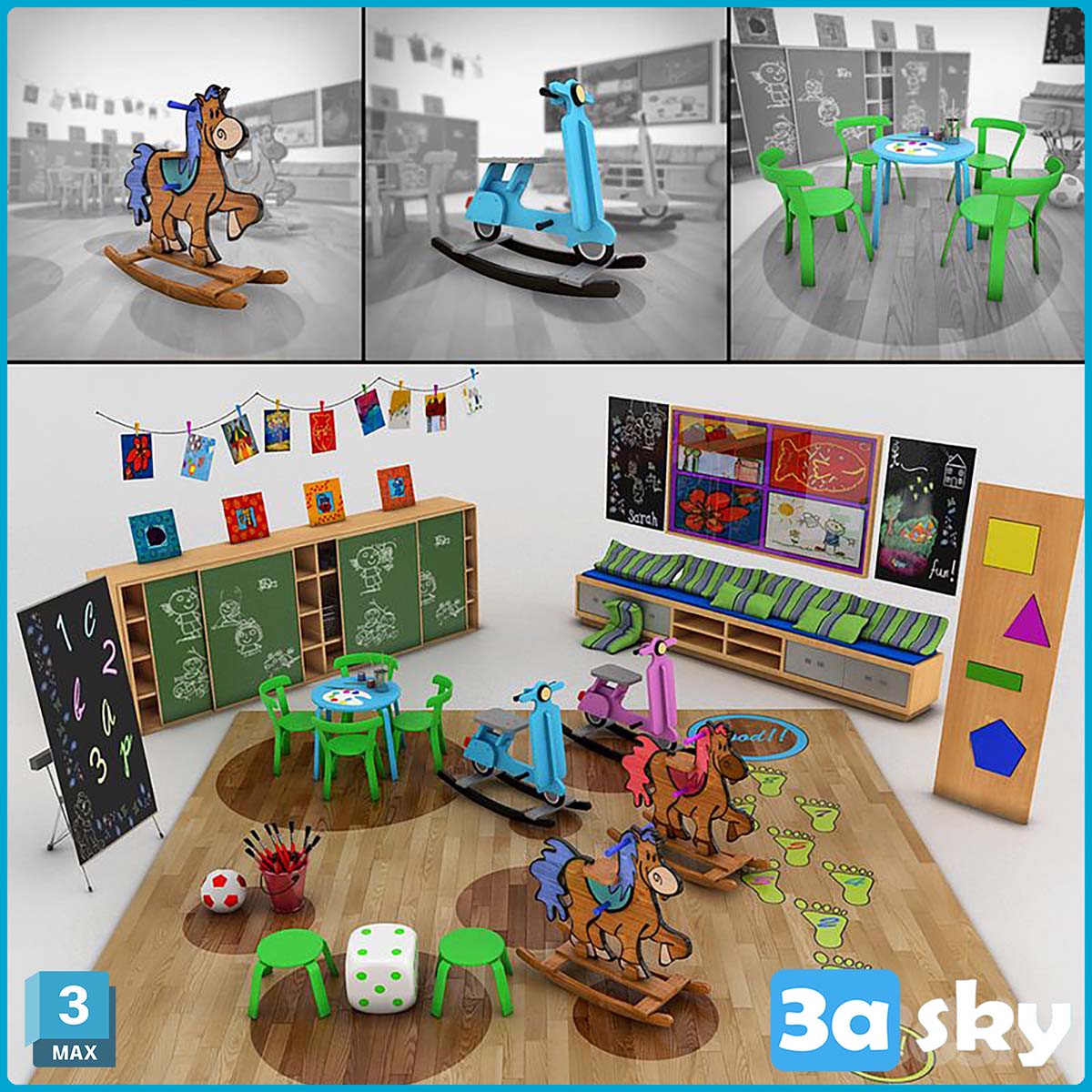 This 3D model showcases a Kindergarten Set, featuring a collection of objects typically found in a kindergarten environment. The model includes various items such as classroom furniture, toys, and educational materials, creating a playful and engaging setting for children. Perfect for educational purposes and creating interactive learning experiences for kids.