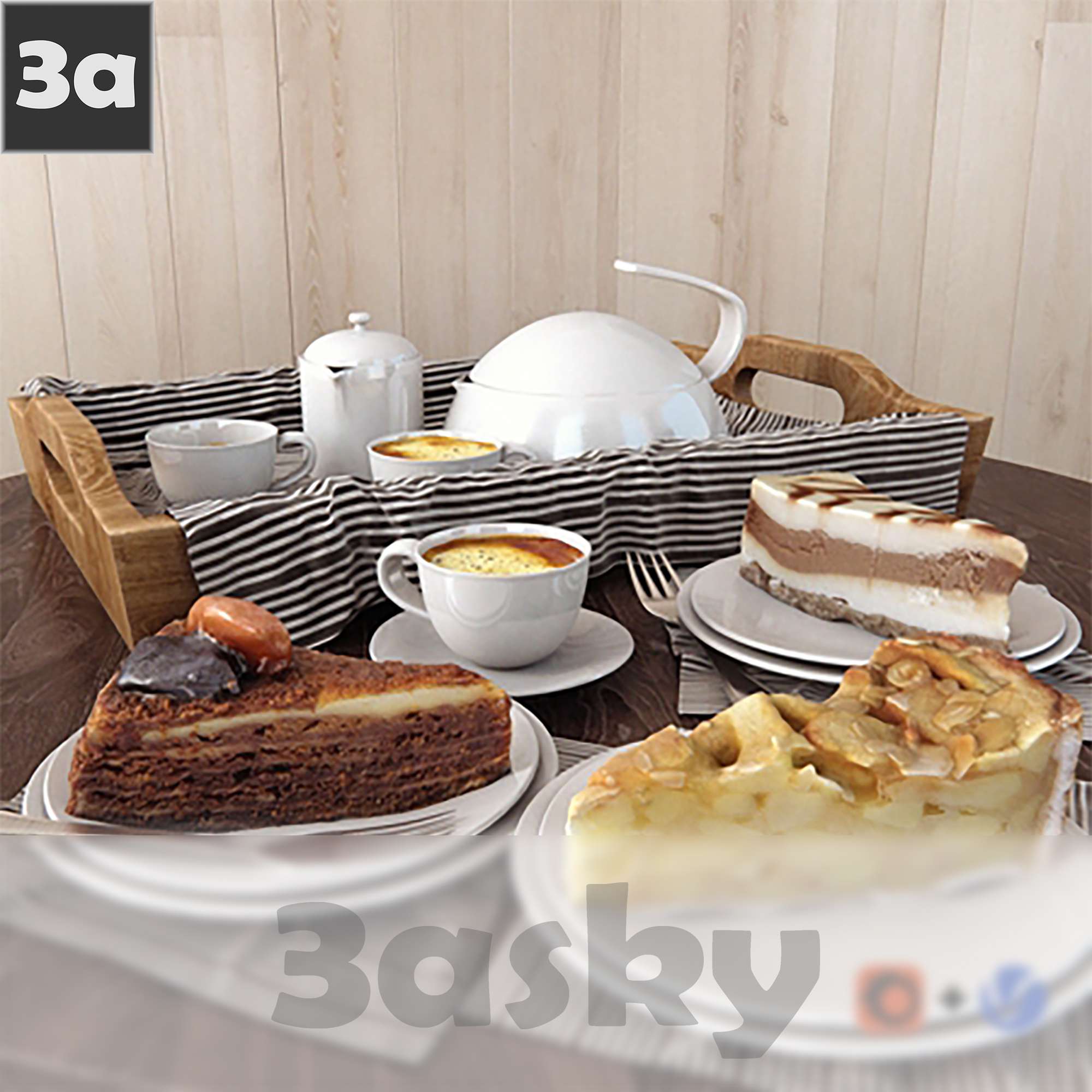 This 3D model showcases a kitchen scene created in 3DS MAX. The image features a set of cakes on display, adding a touch of sweetness to the overall design. Perfect for interior designers, architects, and anyone looking to enhance their projects with high-quality 3D assets.