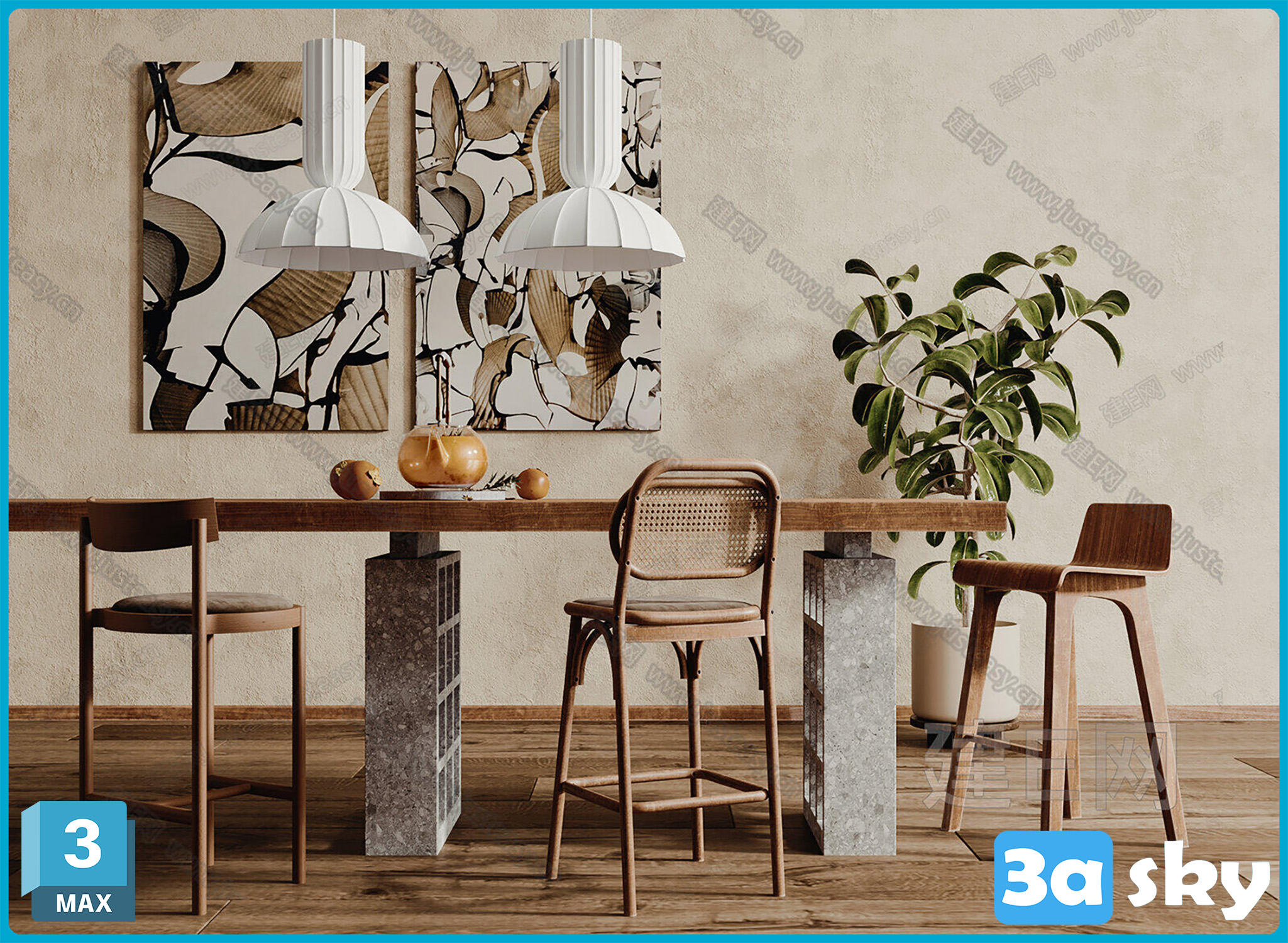 This 3D model showcases a modern kitchen design created using 3DS MAX software. The model includes detailed furniture, appliances, and lighting, making it ideal for interior design projects, architectural visualization, and rendering. The high-quality render provides a realistic representation of a contemporary kitchen space, perfect for professionals and enthusiasts in the design industry.