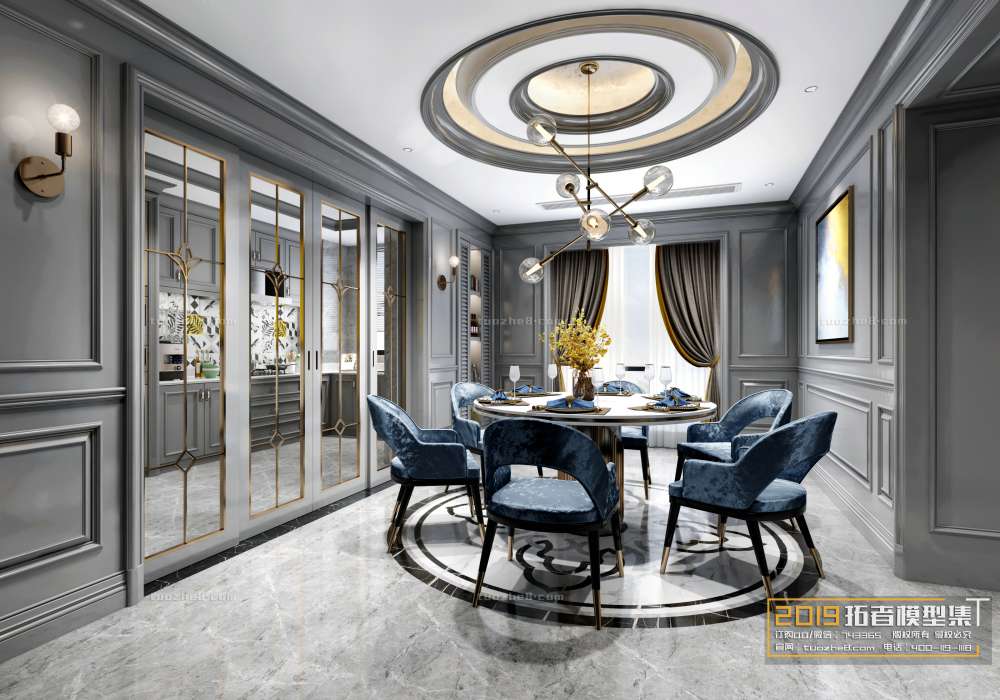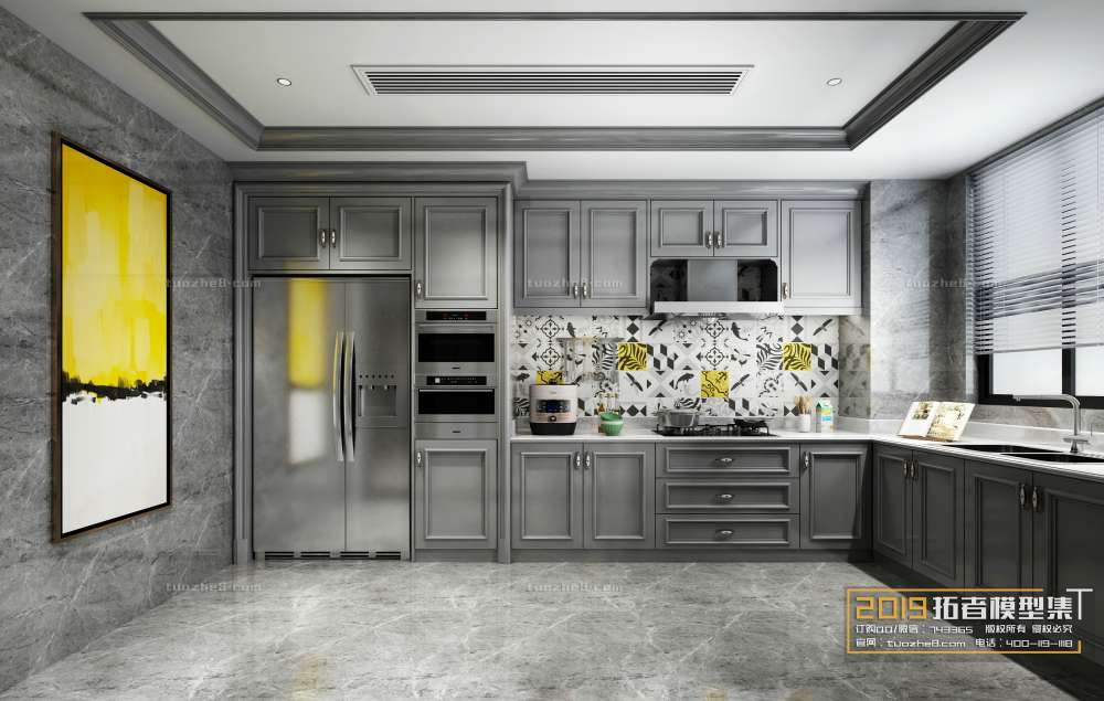 This 3D scene showcases a modern kitchen design created in 3DS MAX. The scene includes detailed interior elements such as furniture and appliances, providing a realistic view of a contemporary kitchen layout.