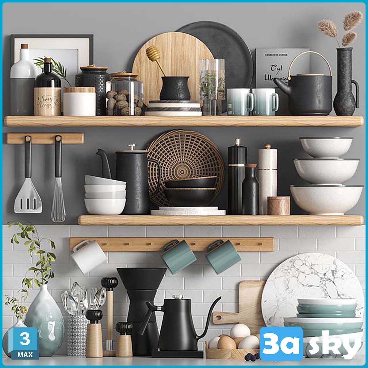 This 3D model file features a collection of kitchen accessories with a focus on eggs. The intricate details and realistic rendering make it ideal for interior design projects. Created using 3DS MAX software, this file is perfect for designers looking to enhance their kitchen design concepts.