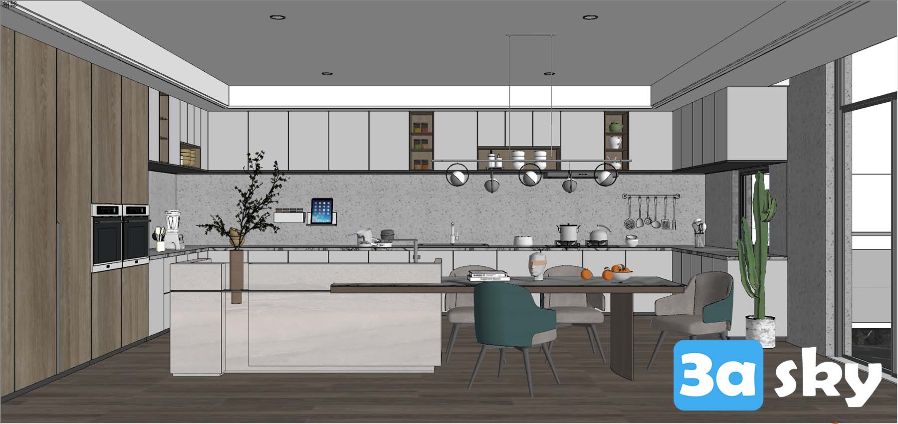 This 3D scene showcases a modern kitchen design with a sleek and contemporary layout. The scene includes various kitchen appliances and features that are visually appealing and functional. Explore this 3D visualization for interior design inspiration.