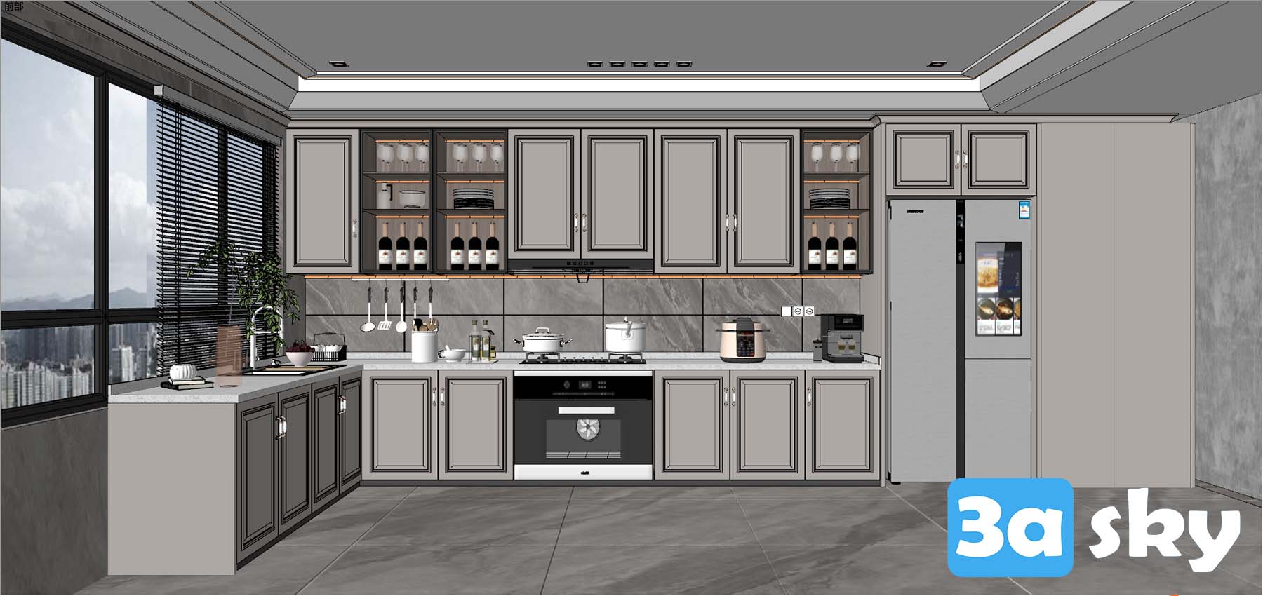This 3D scene showcases a modern kitchen design with sleek and contemporary elements. The layout features stylish kitchen appliances and a functional workspace. Explore this visualization for inspiration on modern interior design.