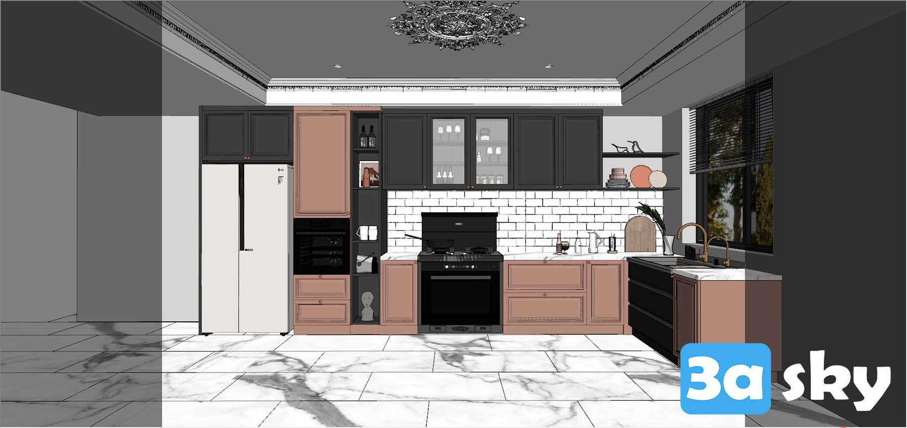 This 3D scene showcases a modern kitchen design with a sleek and contemporary layout. The interior visualization highlights the functionality and aesthetics of the kitchen space, providing inspiration for modern home decor enthusiasts. Explore the details and design elements in this captivating kitchen setting.