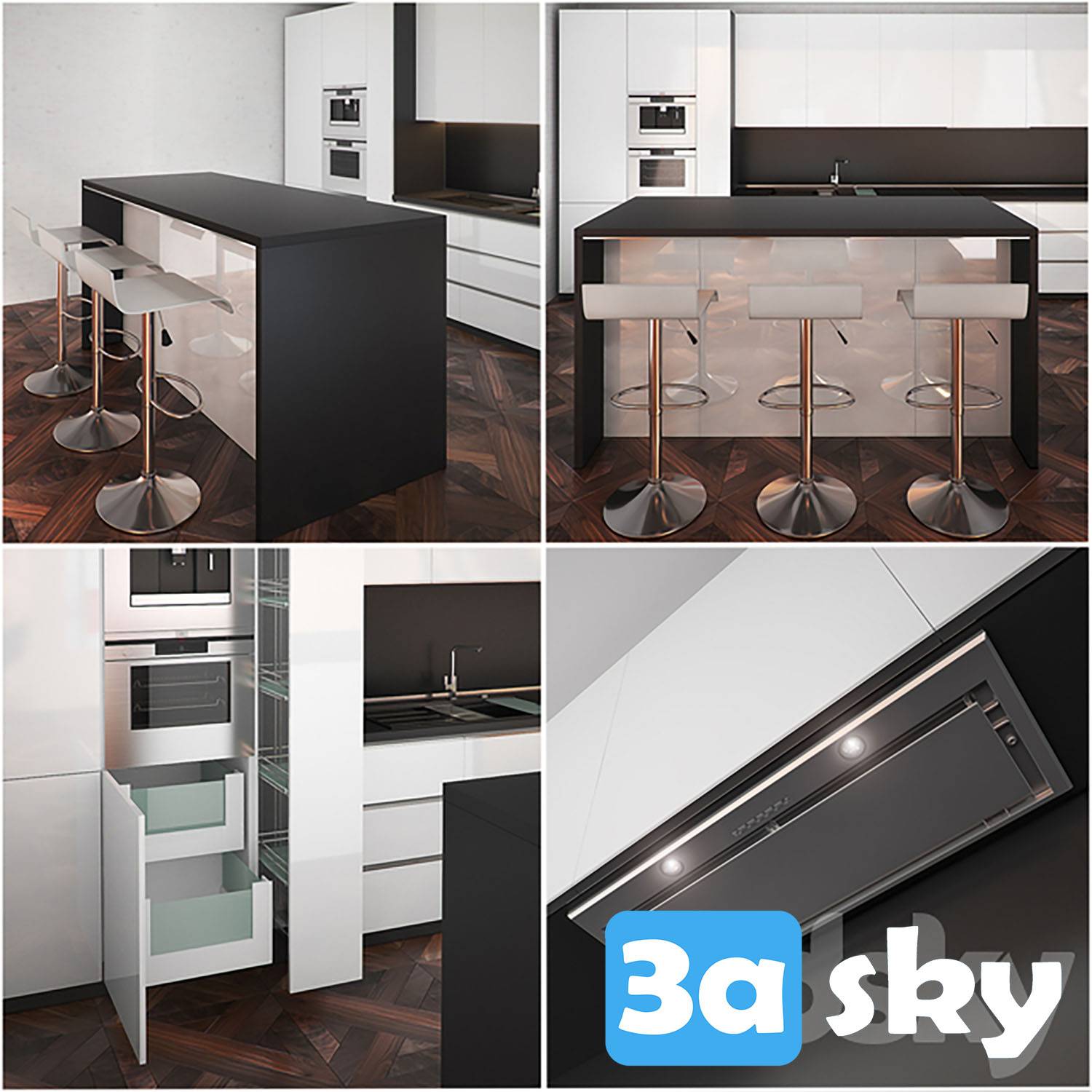 This 3D model showcases a set of kitchen furniture designed in 3DS MAX. It includes various elements such as cabinets, countertops, and appliances, ideal for interior design visualization and architectural projects. The detailed rendering provides a realistic representation of modern kitchen furniture, suitable for use in architectural presentations and interior design planning.