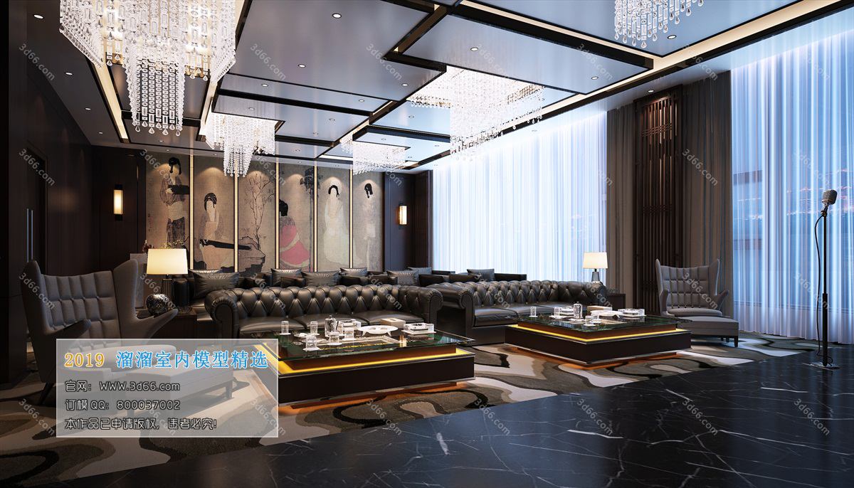 This 3D scene showcases a KTV Bar Sauna with a mix of styles, providing a unique and luxurious ambiance. The design features intricate details and a blend of modern and traditional elements, creating a visually stunning space. Perfect for those looking for inspiration in interior design and architecture.