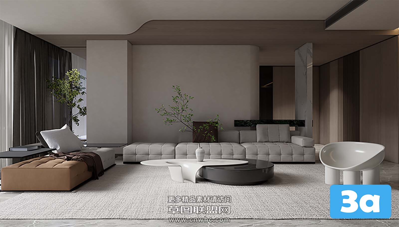 This 3D scene features a modern living room with stylish furniture and decor elements. The design is sleek and contemporary, perfect for those looking for inspiration for their own interior design projects.