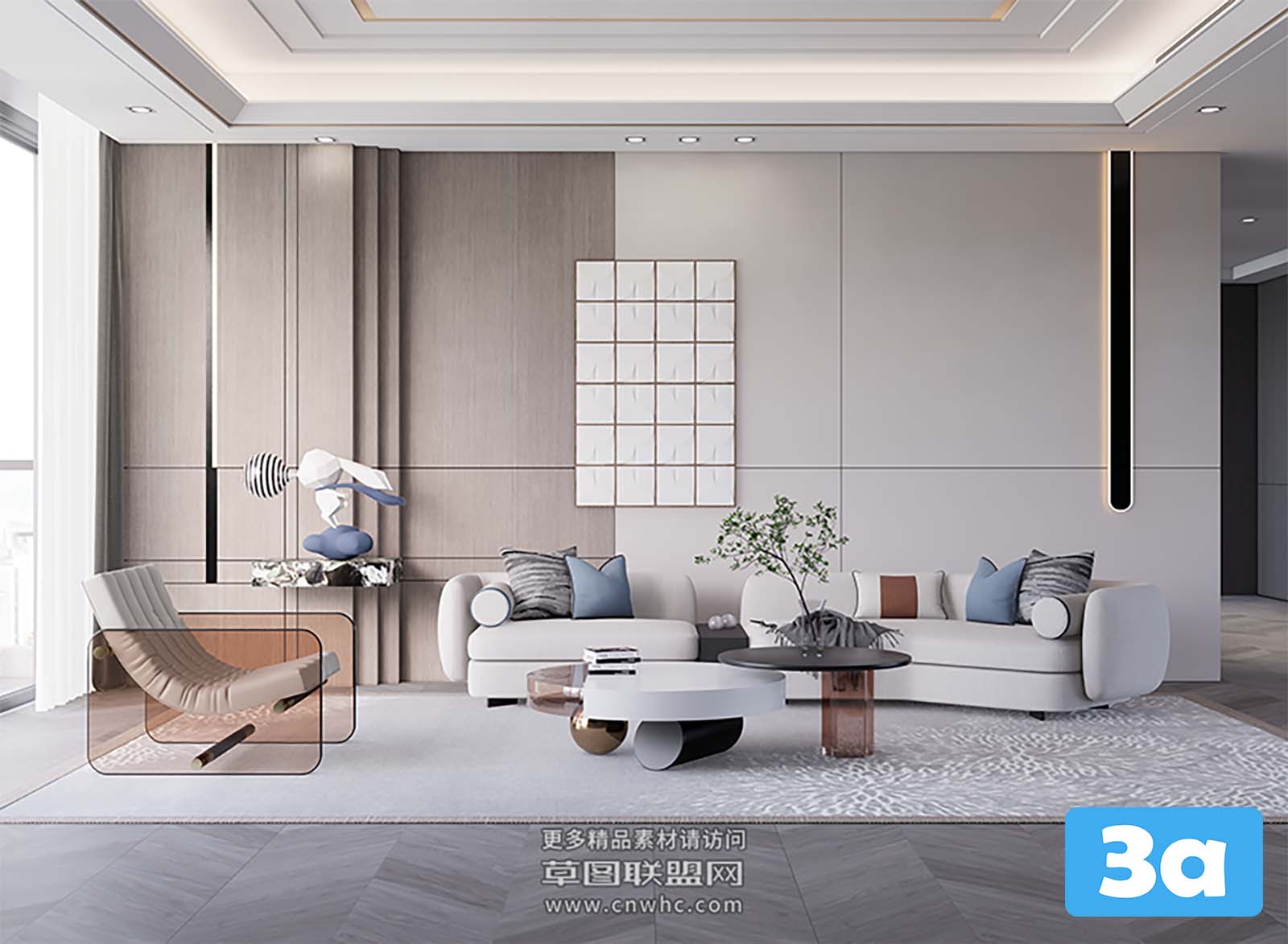 This 3D scene features a modern living room setup with stylish furniture and decor elements. The design showcases a blend of contemporary and cozy aesthetics, perfect for interior design inspiration. Explore the details of this living room scene to gather ideas for your own home decor projects.