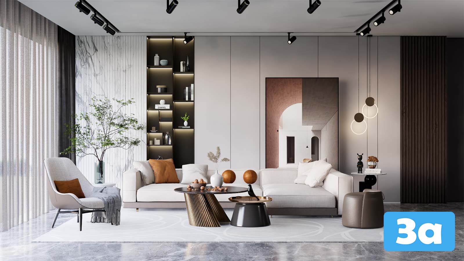 This 3D scene features a modern living room setup with stylish furniture and decor. The design showcases a blend of contemporary and minimalist elements, creating a cozy and inviting space. Explore the details of this interior design concept and get inspired for your own home decor projects.