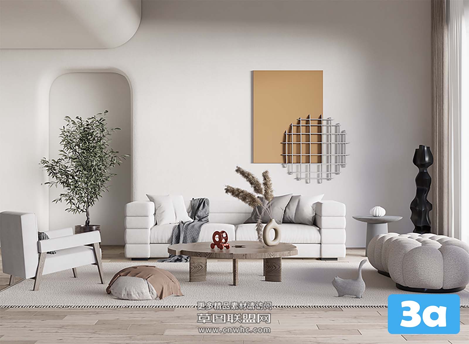 This 3D scene features a modern living room setup with stylish furniture and decor elements. The design showcases a blend of contemporary and cozy aesthetics, perfect for interior design inspiration. Explore the arrangement of furniture, lighting, and accessories in this virtual living space.
