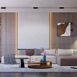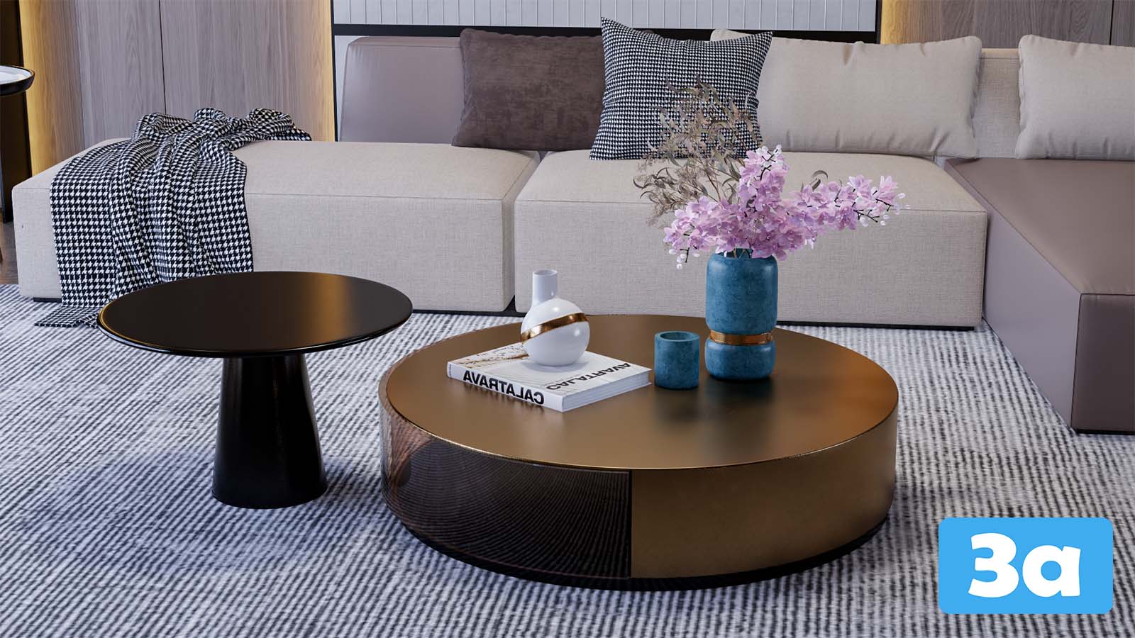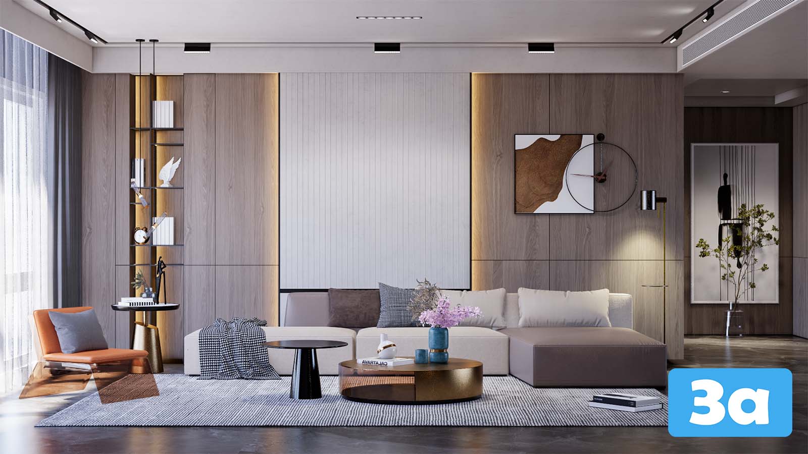 This 3D scene features a modern living room setup with stylish furniture and decor. The design showcases a blend of contemporary and minimalist elements, creating a cozy and inviting space. Explore the details of this interior design concept and get inspired for your own home decor projects.